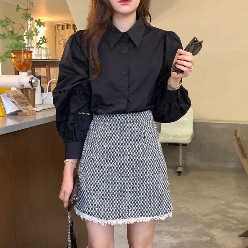 オータムスタンダードスリーブシャツ ツィードハイウェストウェストスカート ランタンスリーブ レトロ 秋物 7/20 mi461504665919