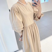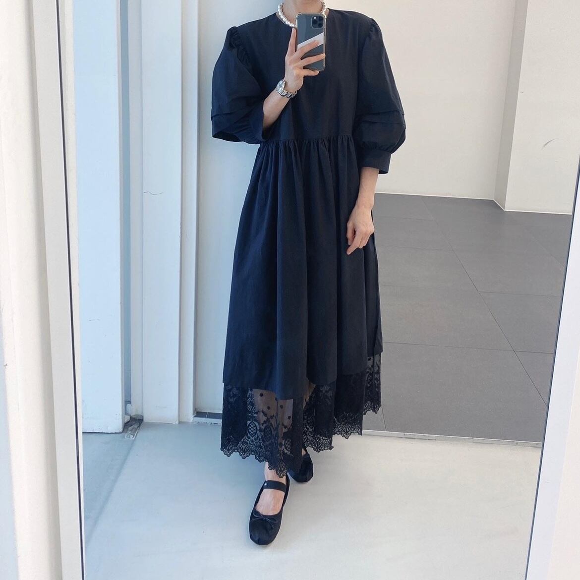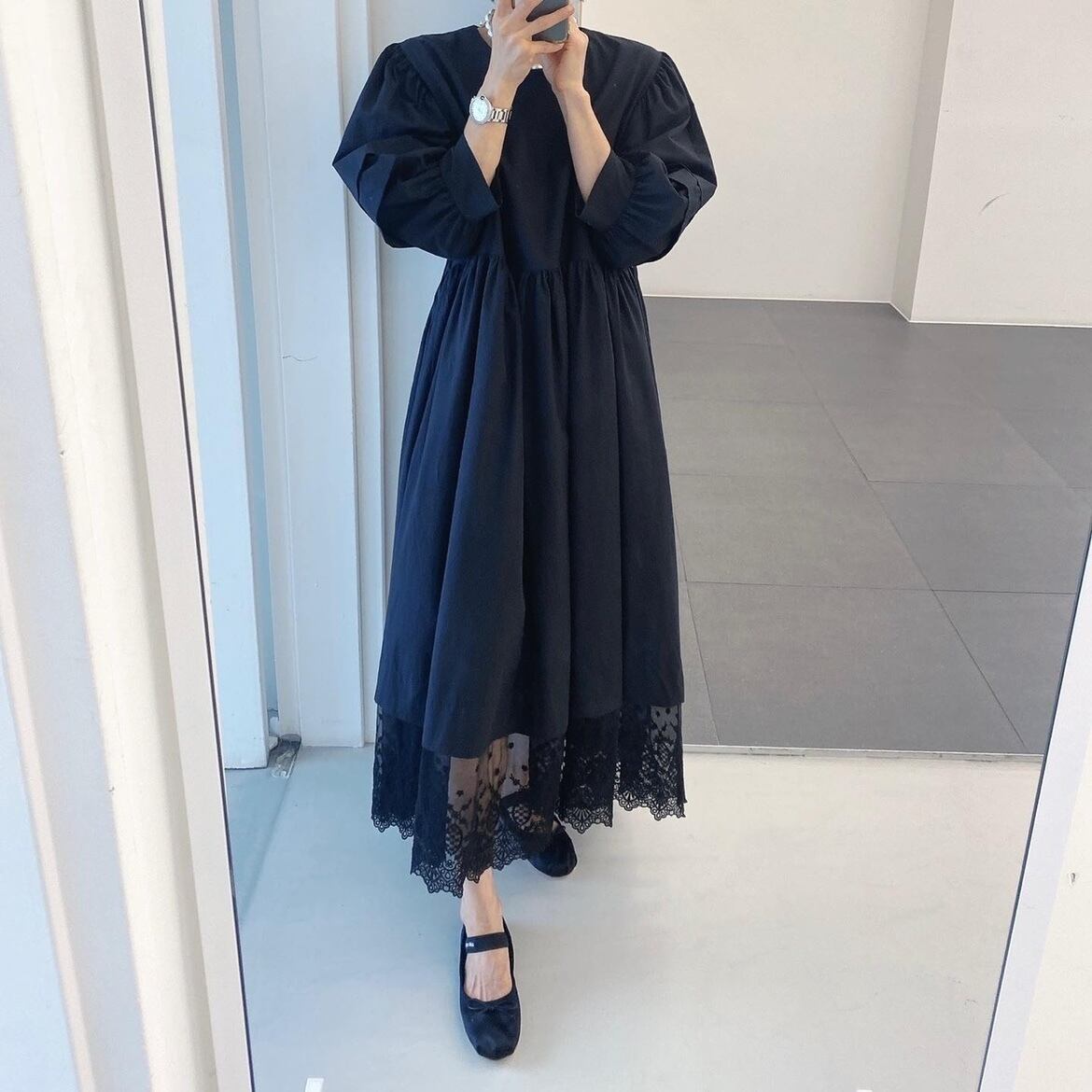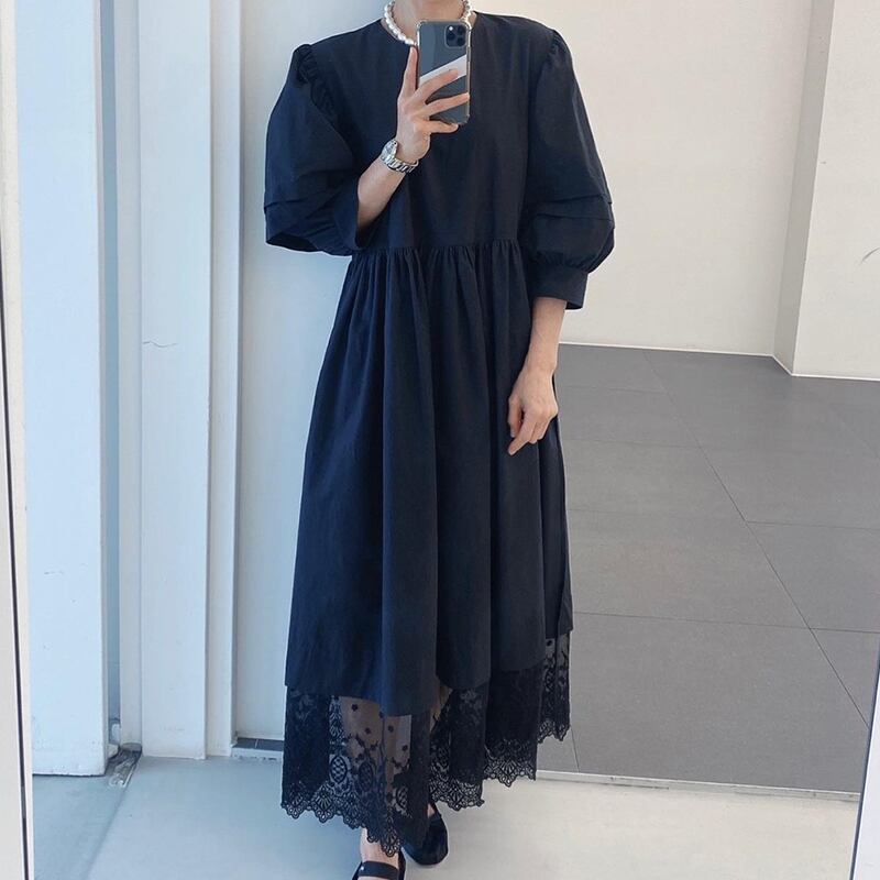オータムスタンダードラウンドネックプリーツレースFlowerデザイン スリーブドレス ロングスカート レトロ 秋物 Oネック フラワーデザイン ステッチ 7/20 mi4615712435887