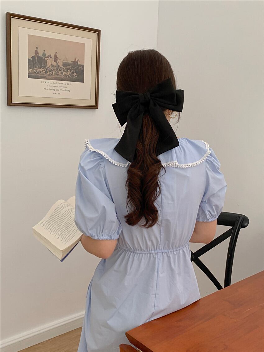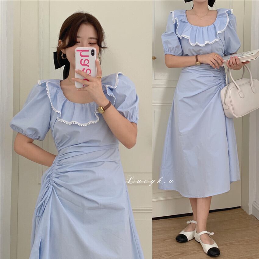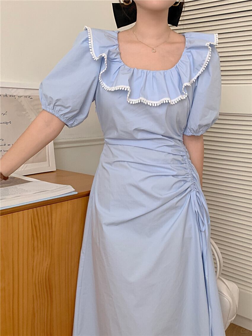 ブルーホワイトカラーギャザーサイドスリットドレス レディース スクウェア 7/20 mi4647237392352