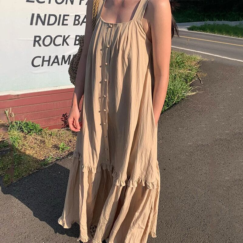 カラーボタンドレス ロングスカート エレガント スクウェア ステッチ 7/20 mi4691834701723