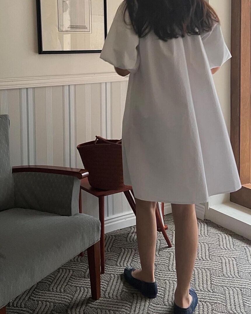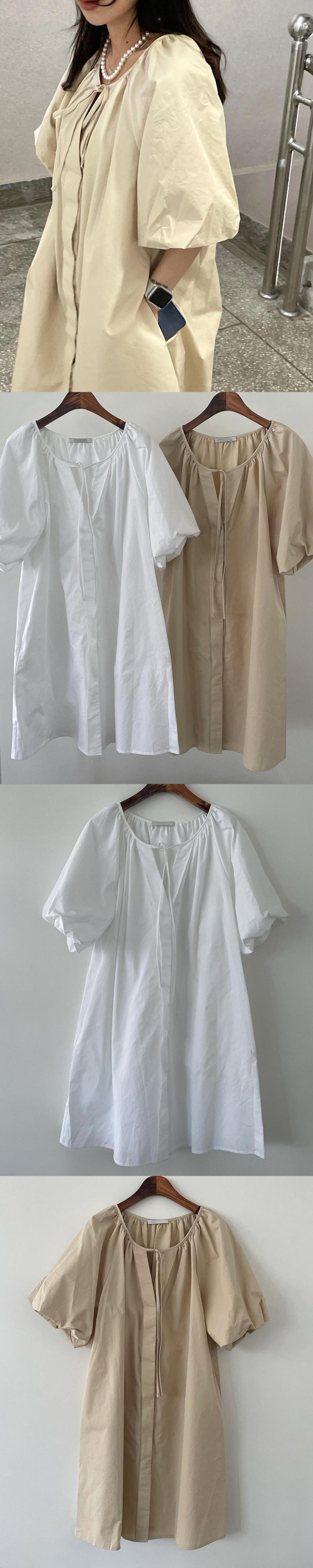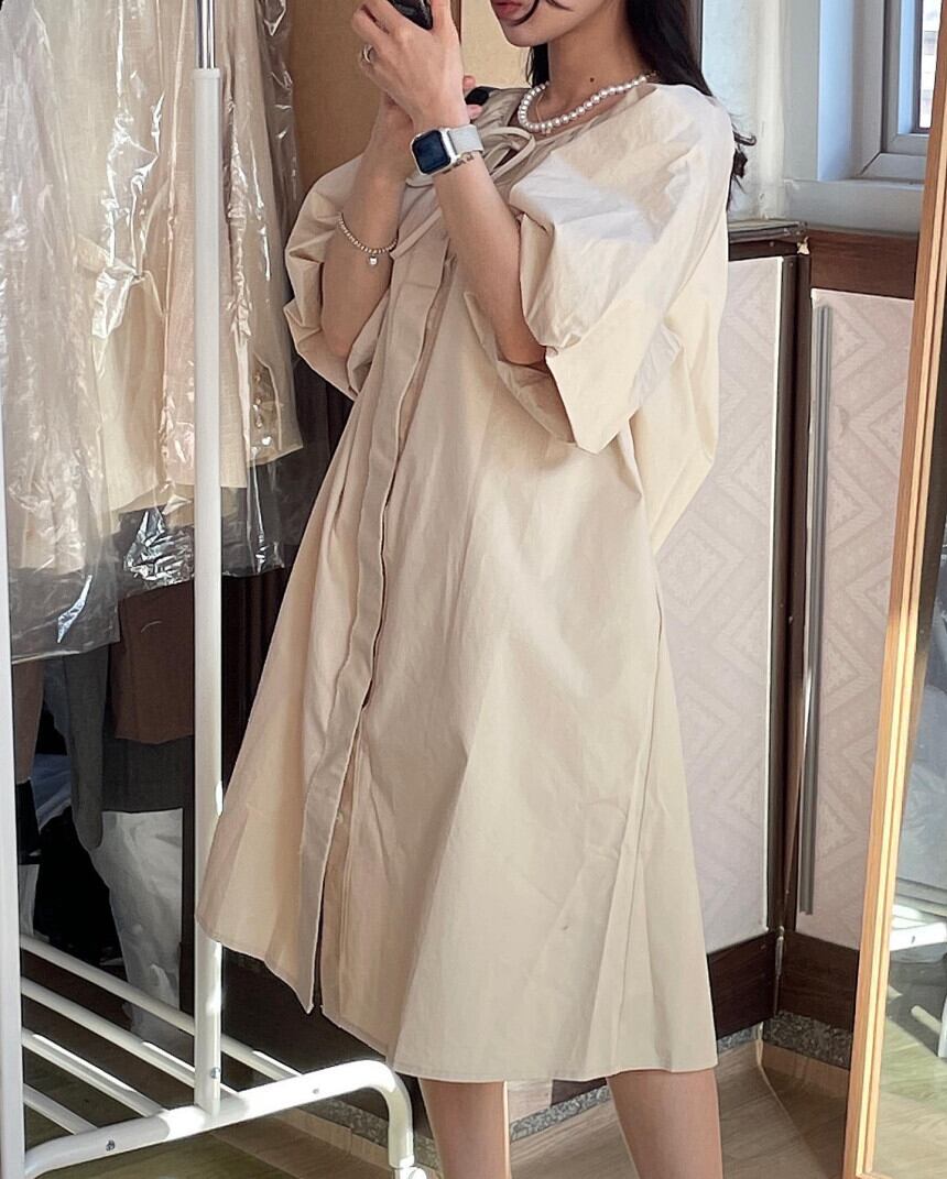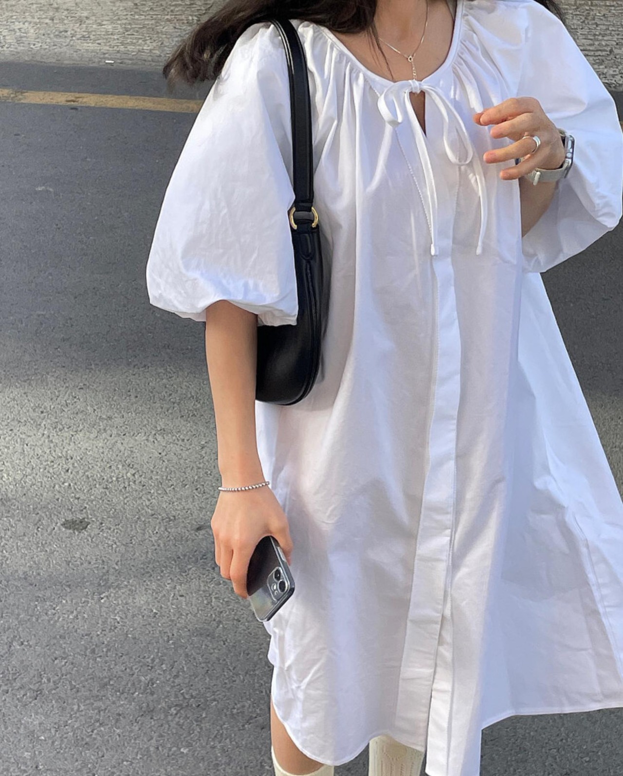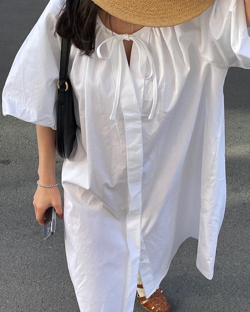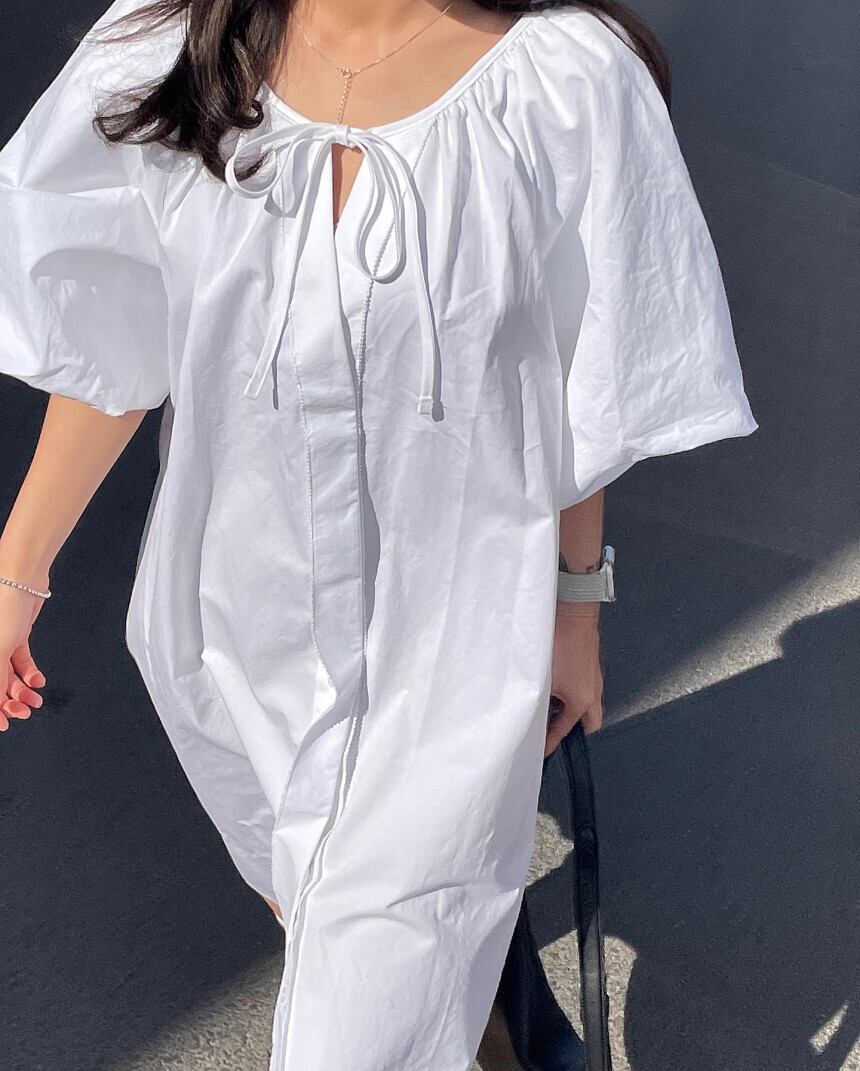 サマーラウンドネックリボンルーズソリッド カラーカジュアルドレス ランタンスリーブ 夏物 Oネック ソリッドカラー 7/20 mi4650602669236