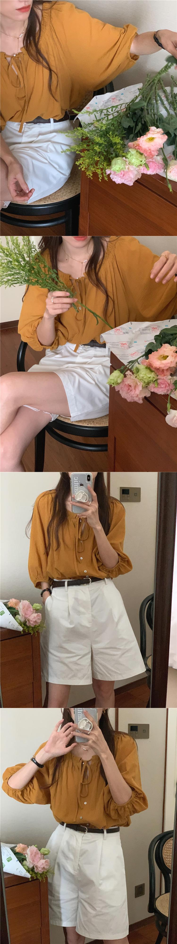 サマーラウンドネックギャザーリボンルーズカジュアルスリーブシャツ トップス 夏物 Oネック 7/20 mi4631695715772