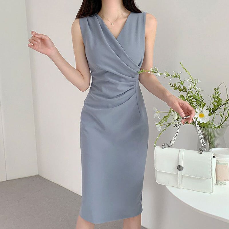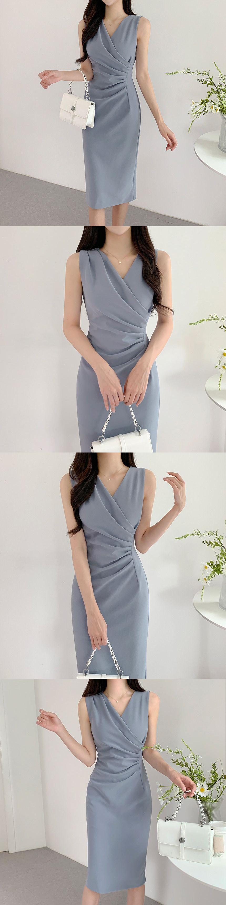 サマークロスVネックプリーツウェスト薄手ノースリーブドレス 夏物 7/20 mi4649207017439