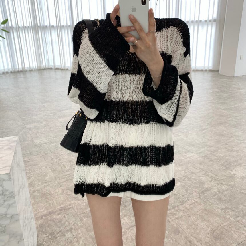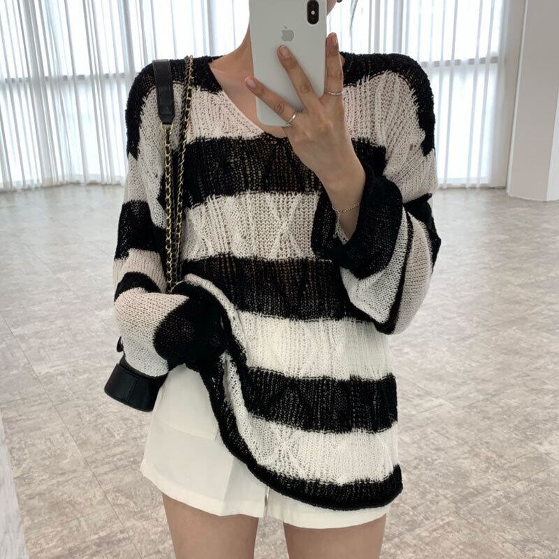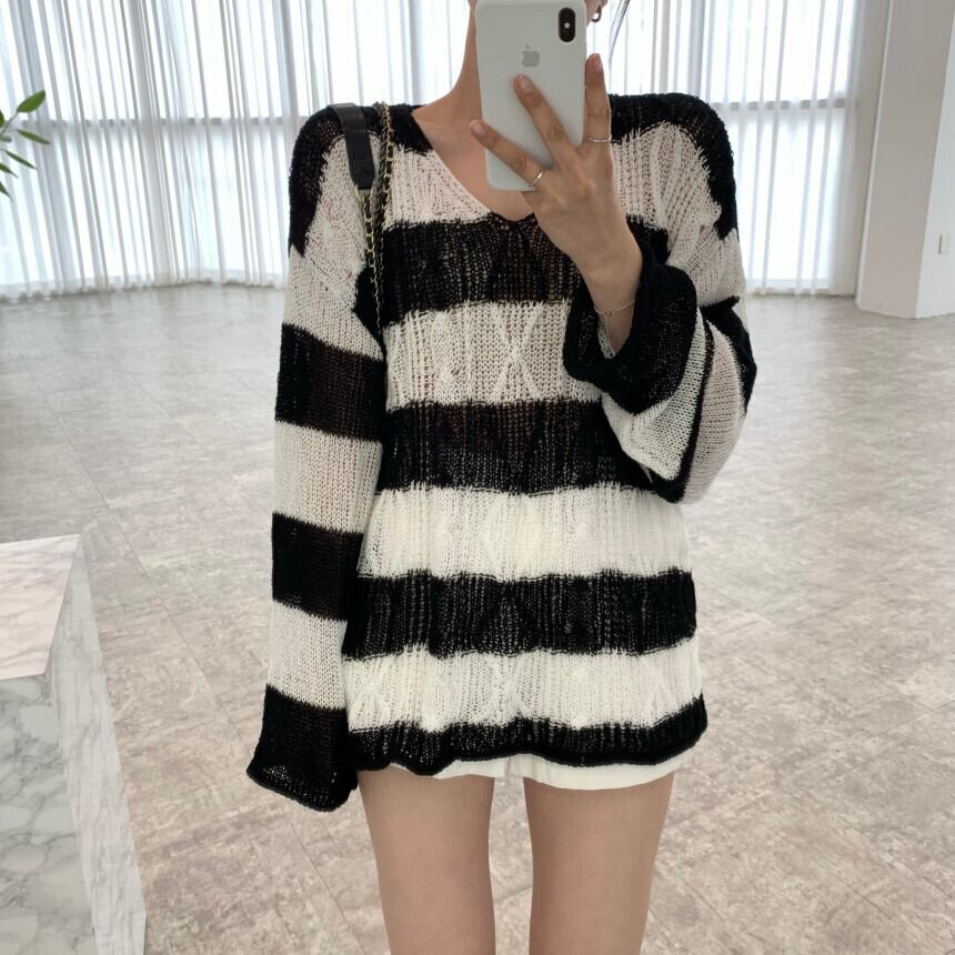 カジュアルスタイルVネックパターンストライプセーター レディース ロング 7/20 mi462683361587