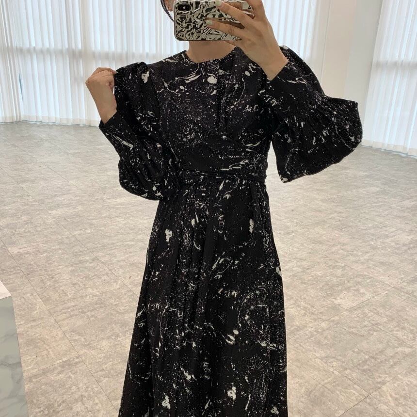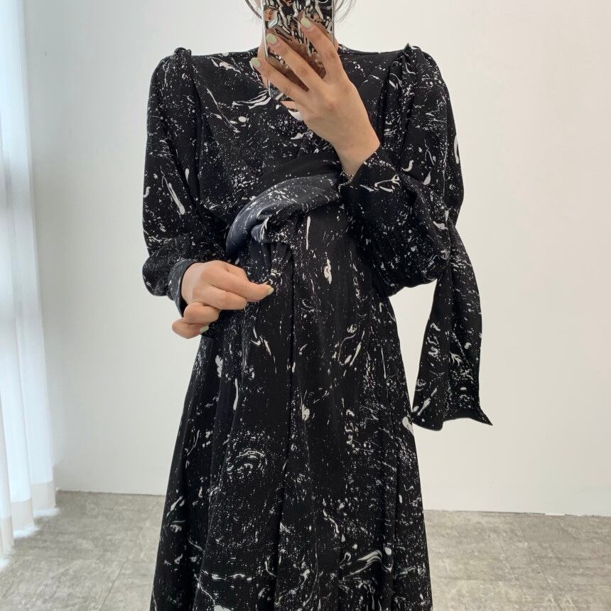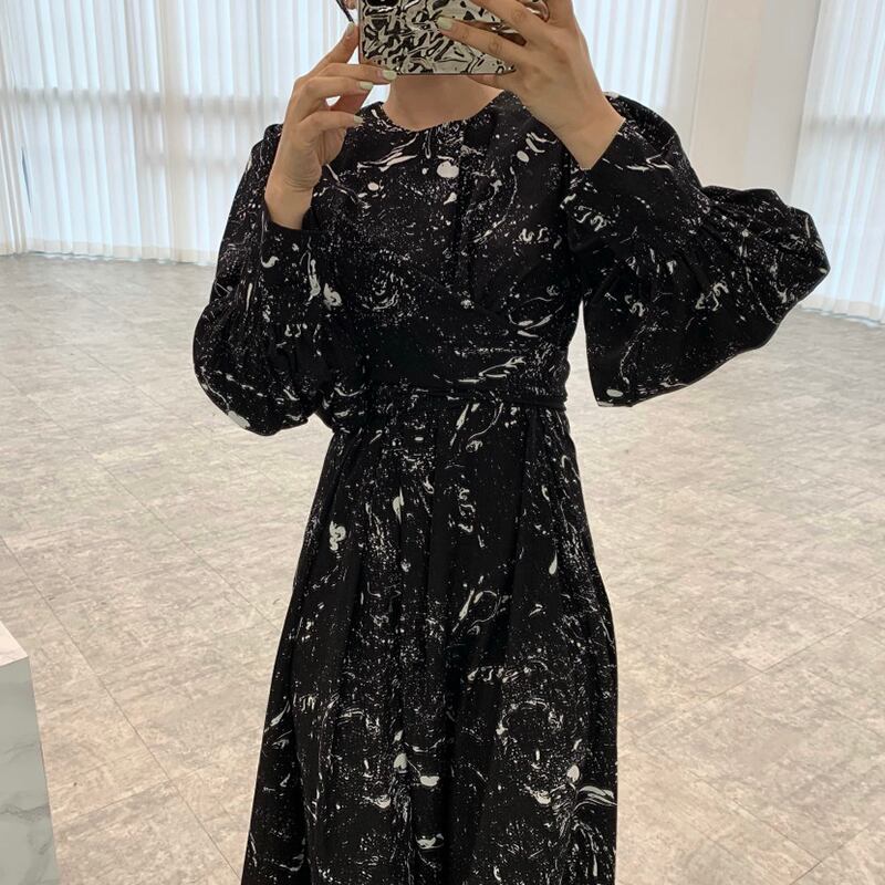 オータムスタンダードラウンドネックプリント柄クロスストラップ ウェストスリムドレス ロング レトロ 秋物 Oネック 7/20 mi4676873689014