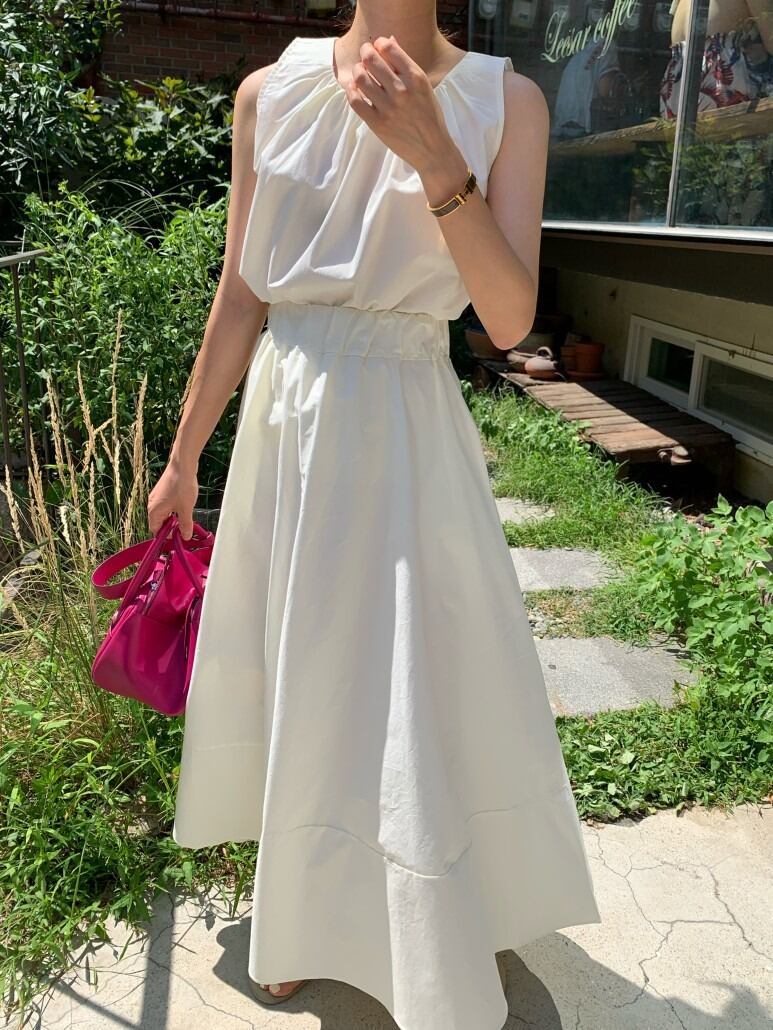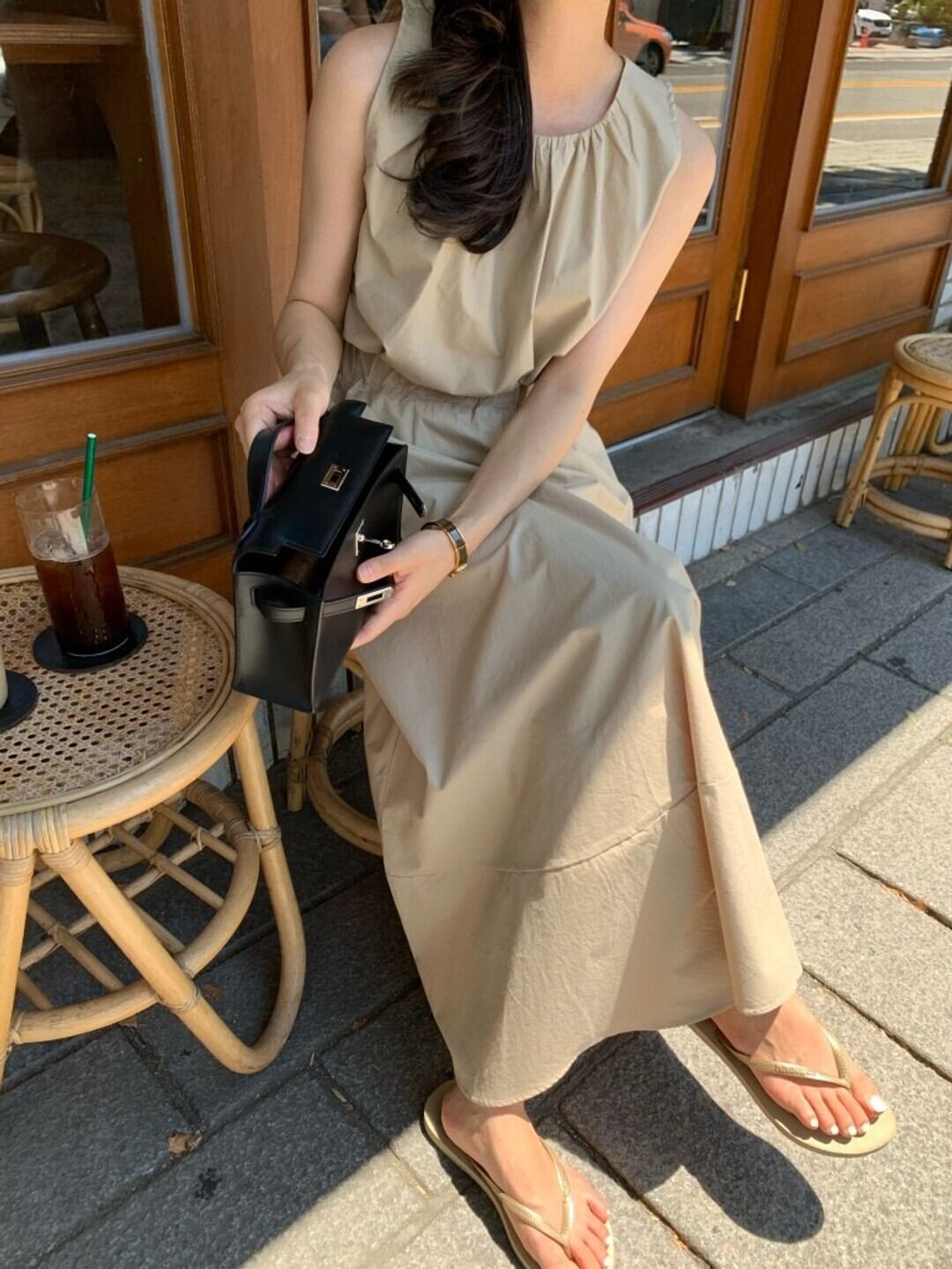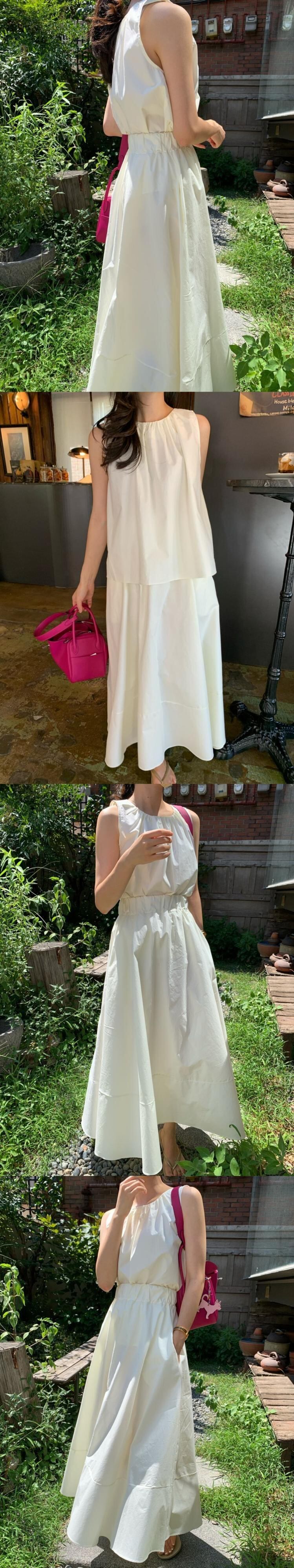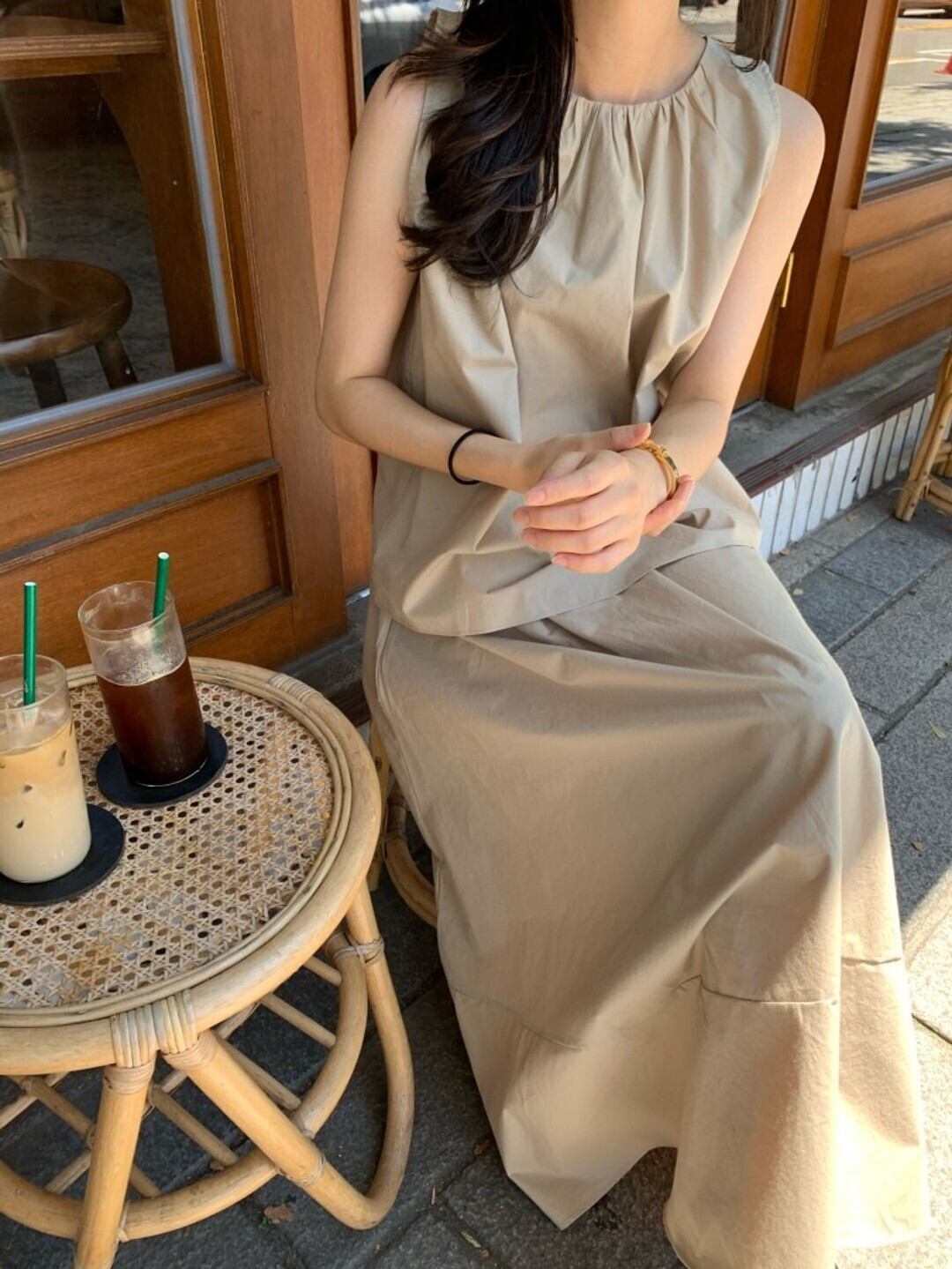 サマーラウンドネックルーズノースリーブトップス ハイウェストウェストポケットロングスカート 夏物 Oネック 7/20 mi4689222766017