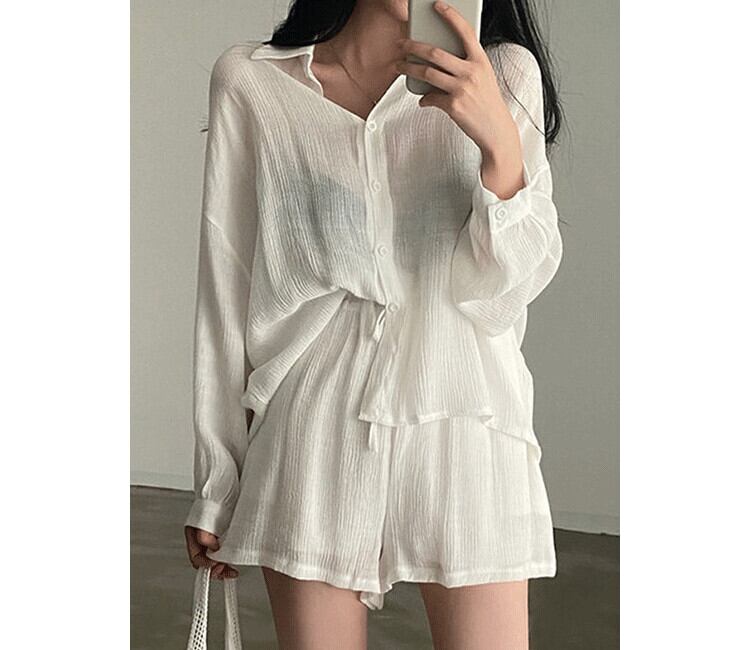 ルーズ薄手シャツ トップス サマーハイウェストウェストワイドレッグカジュアルショーツ セット ロング 夏物 ブルマー ワイドパンツ 7/20 mi4668053449201