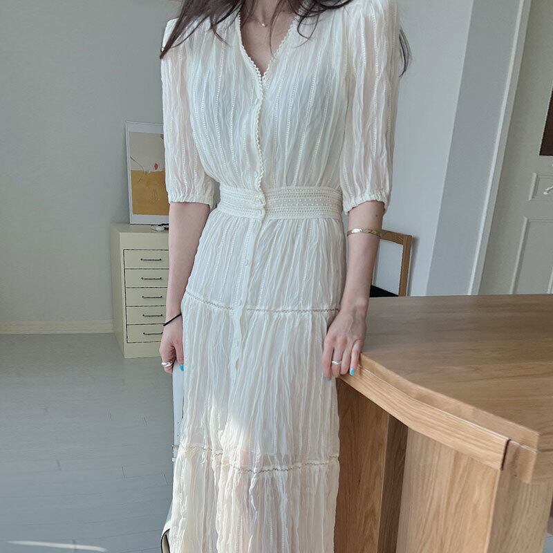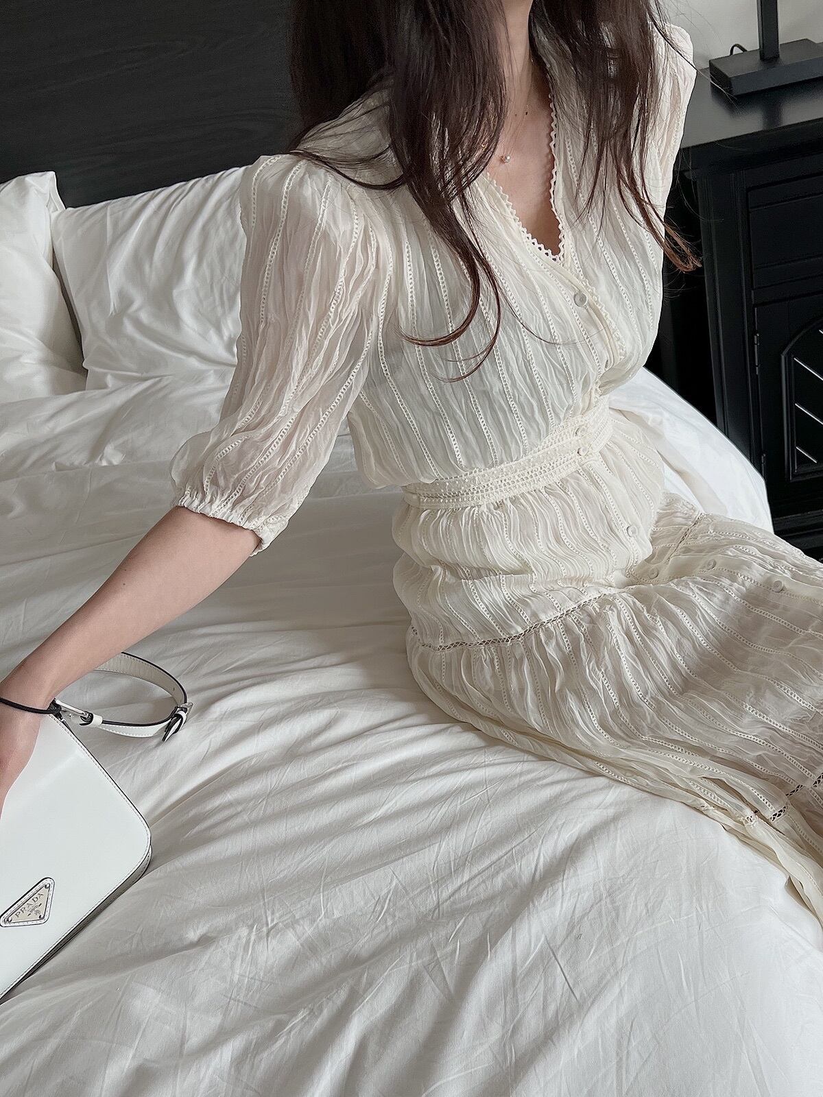 サマーVネックレースドレス レディース エレガント 夏物 ステッチ 7/20 mi4673800349317