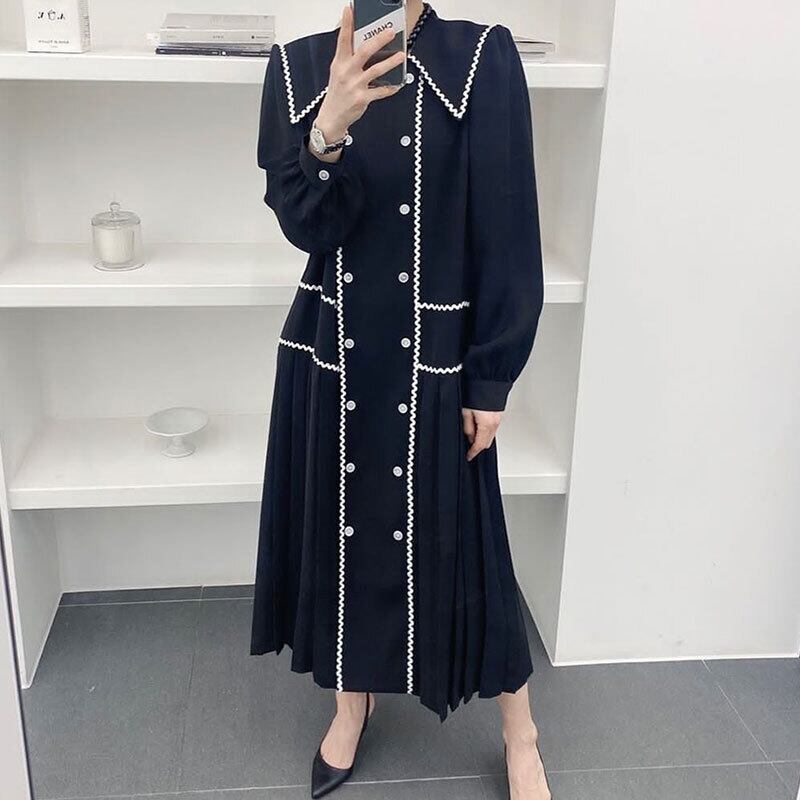 オータムスタンダードカラーレースダブルブレストプリーツドレス レディース ロング レトロ 秋物 ステッチ 7/20 mi4649783199508