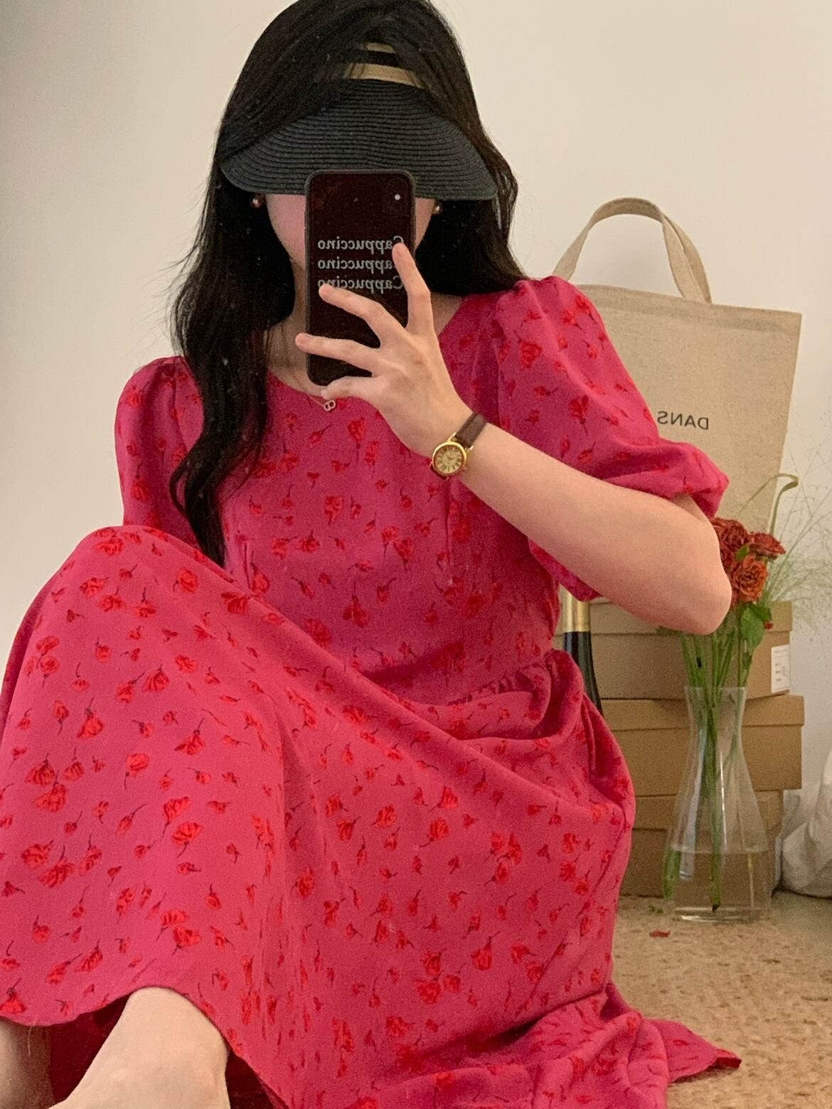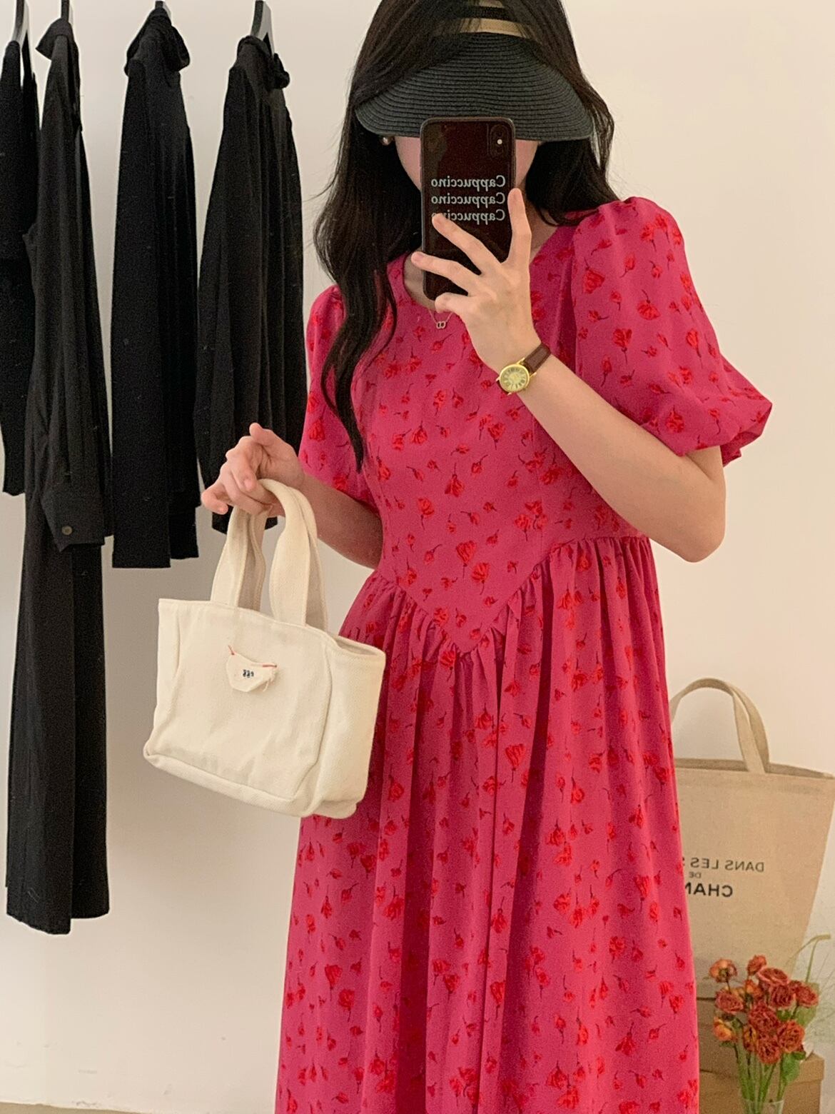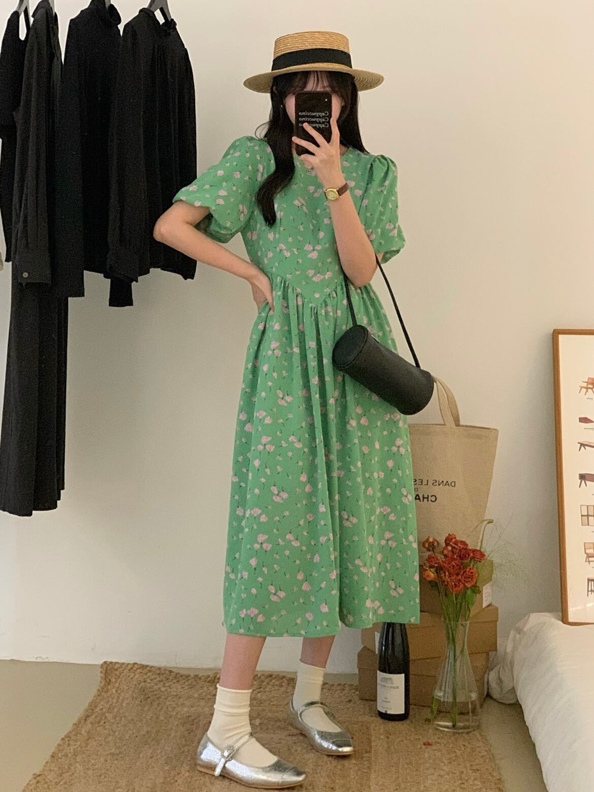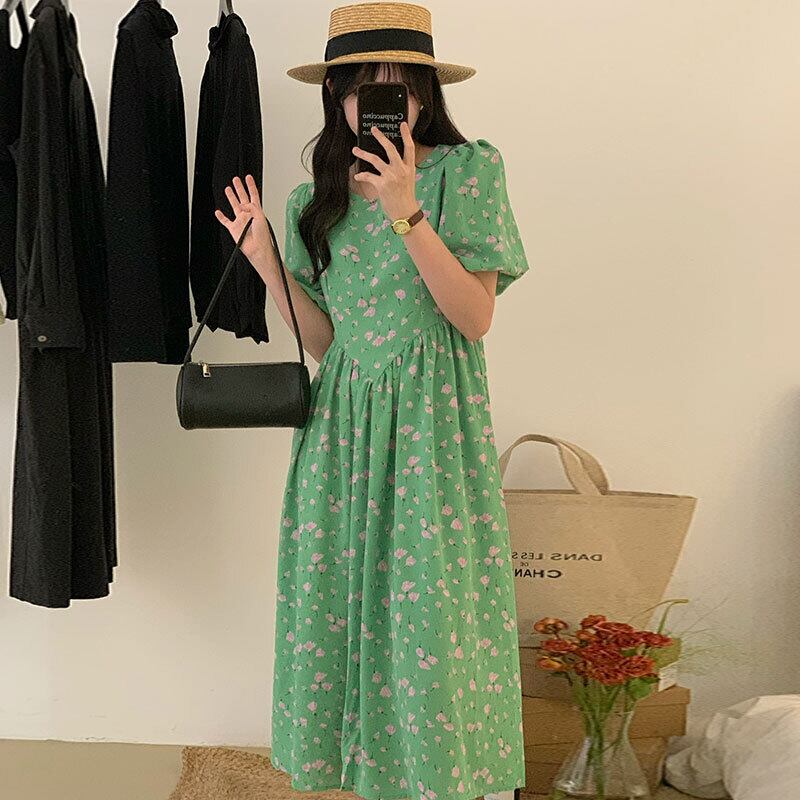 サマースタンダードラウンドネックプリーツウェスト薄手スリーブフローラルドレス ロングスカート ランタンスリーブ レトロ エレガント 夏物 花柄 Oネック 7/20 mi4643033070889