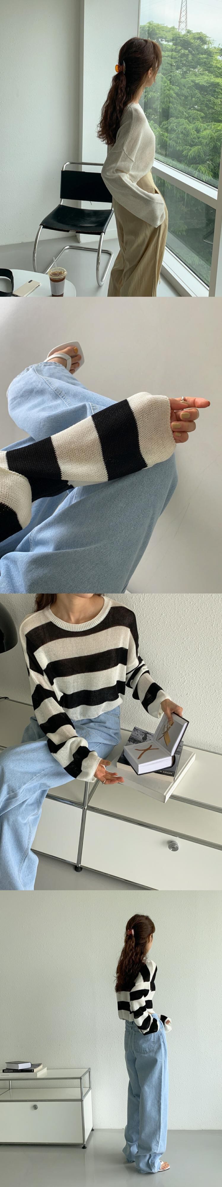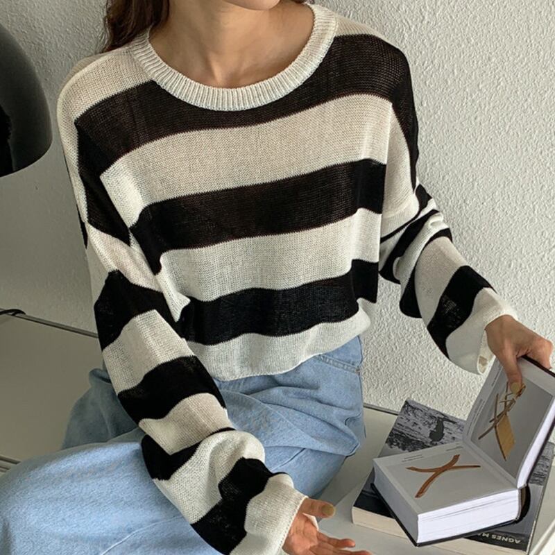 サマーラウンドネックカラーストライプ薄手プルオーバー セーター トップス レディース ロング 夏物 Oネック シルク 7/20 mi4682758577144