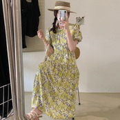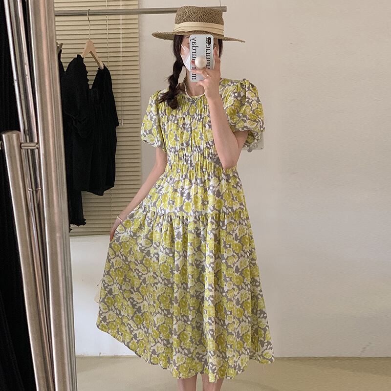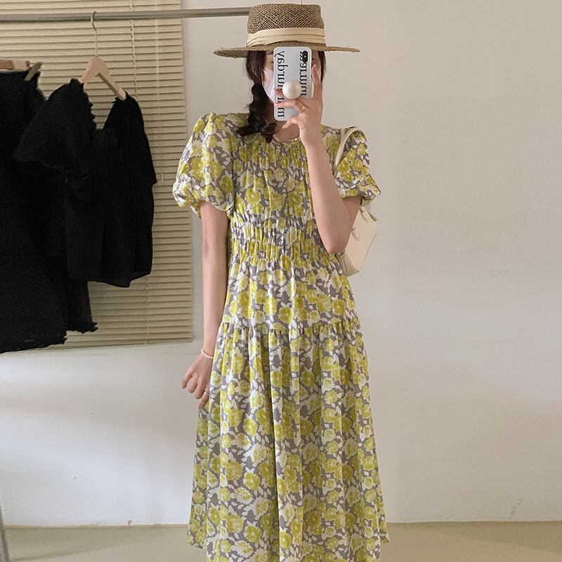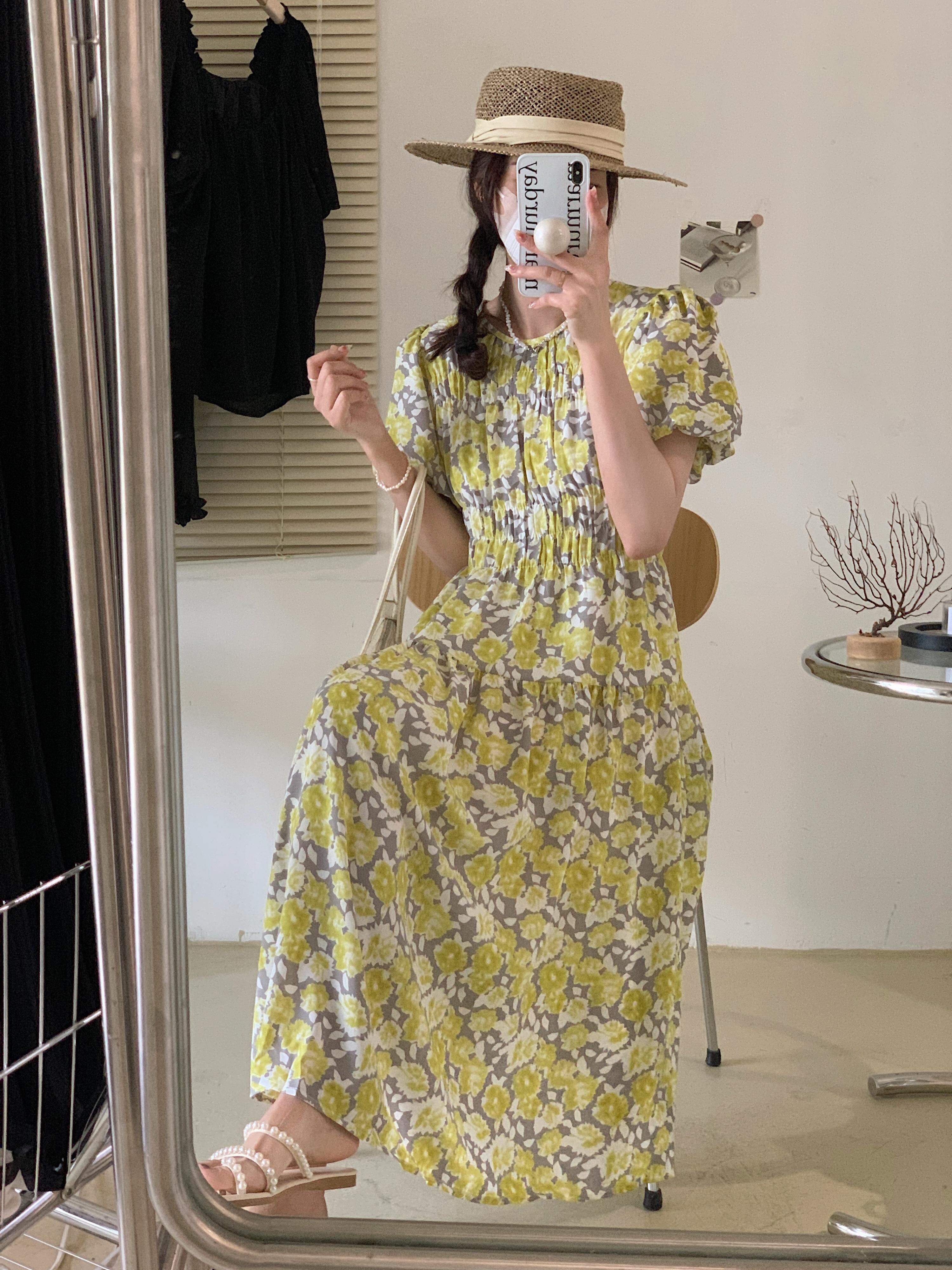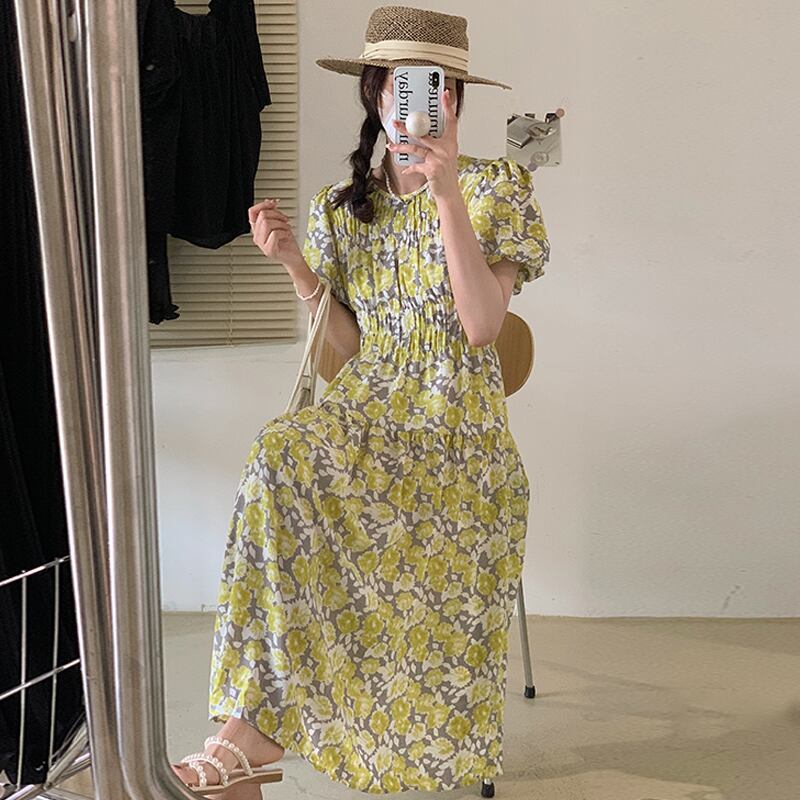 サマーラウンドネックプリーツウェスト薄手フローラルドレス ロングスカート エレガント 夏物 花柄 Oネック 7/20 mi4618389175850