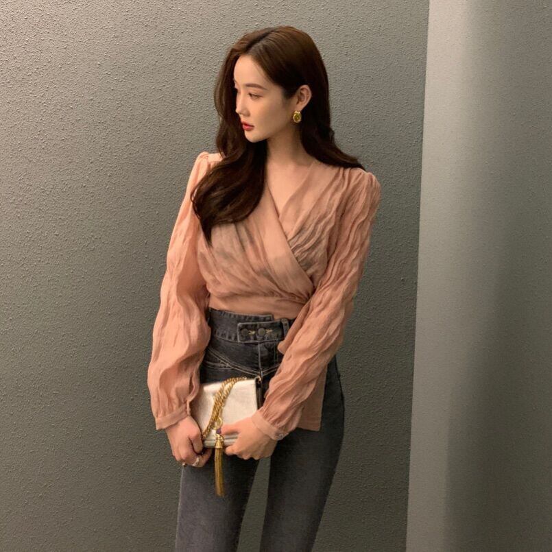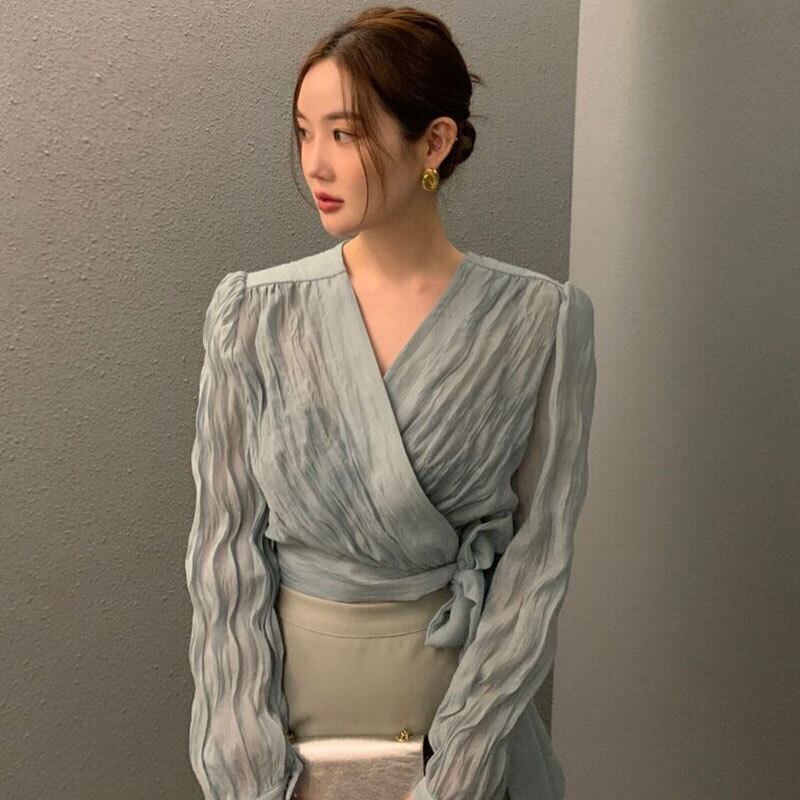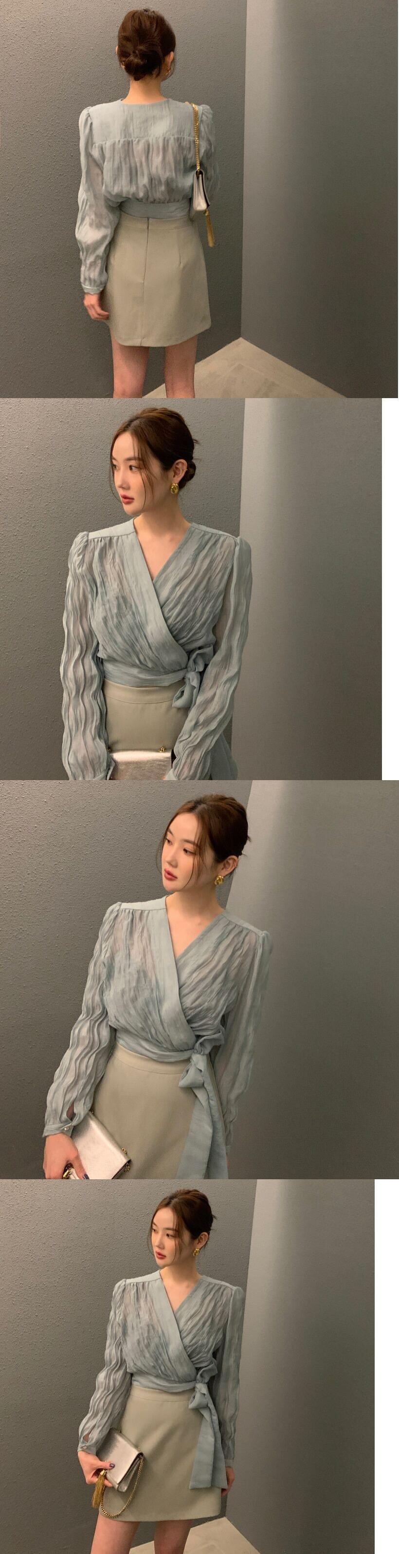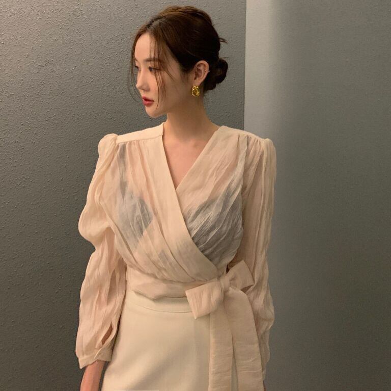 スプリングクロスVネックストラップ リボンプリーツスリーブシャツ トップス レディース エレガント 春物 7/20 mi4671448028499