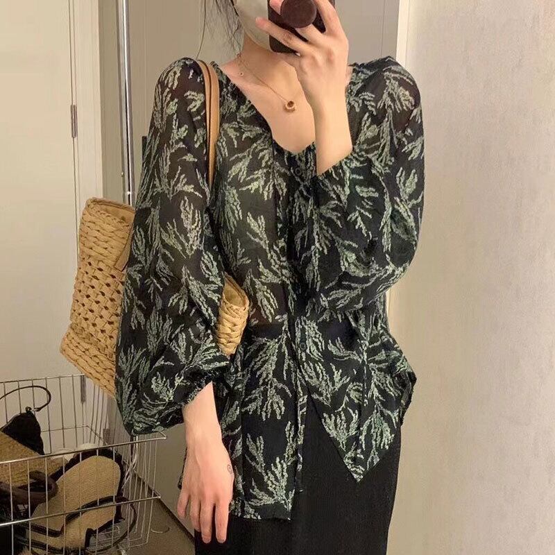 サマースタンダードVネックルーズカジュアルフローラルシャツ トップス ランタンスリーブ レトロ 夏物 花柄 7/20 mi4652001942896