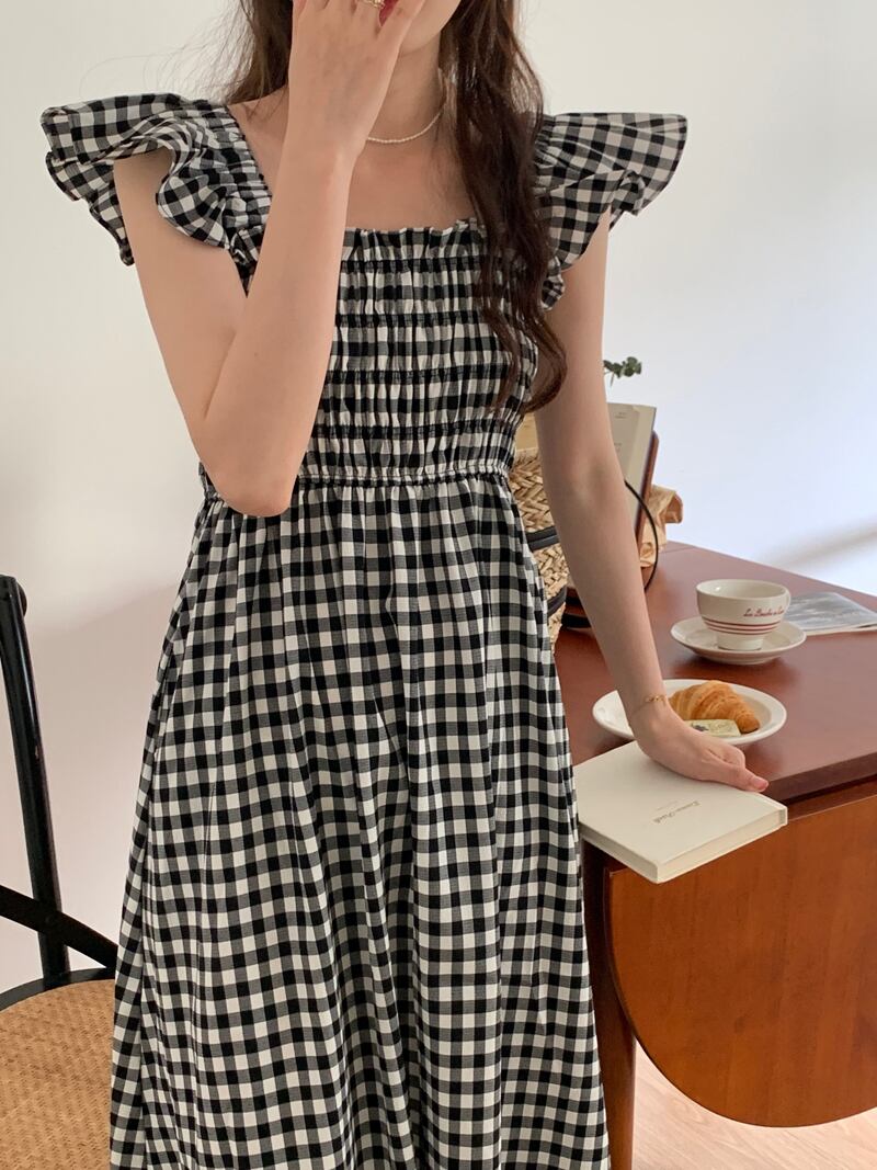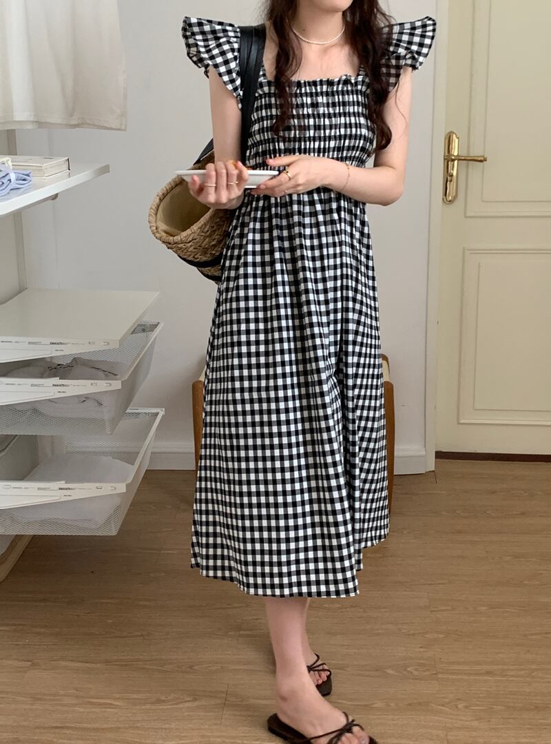 サマースタイルカラーウェストスリムスリーブ格子柄ドレス 夏物 スクウェア 7/20 mi4697642944771