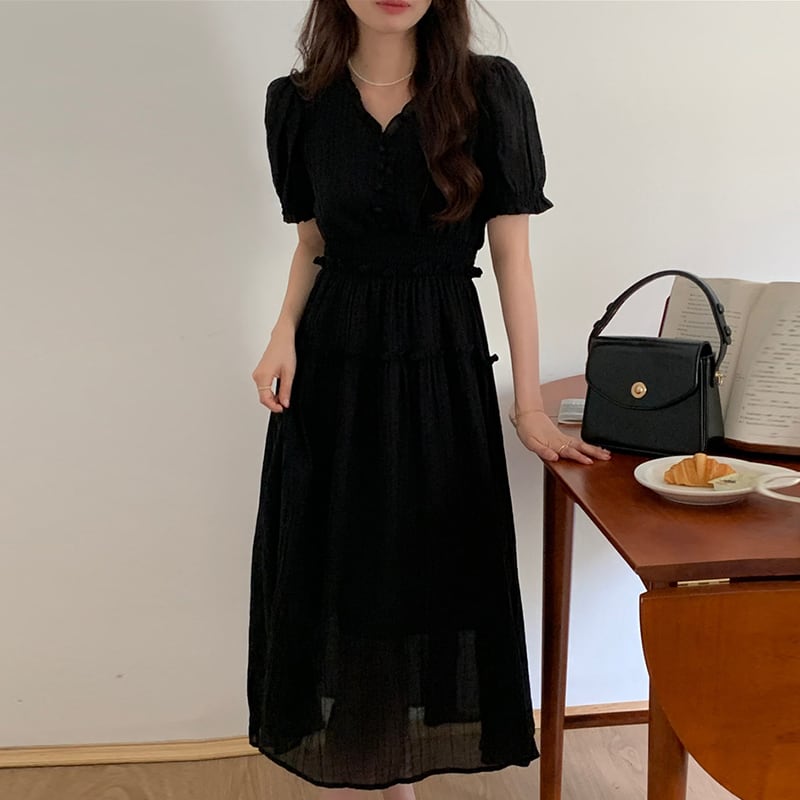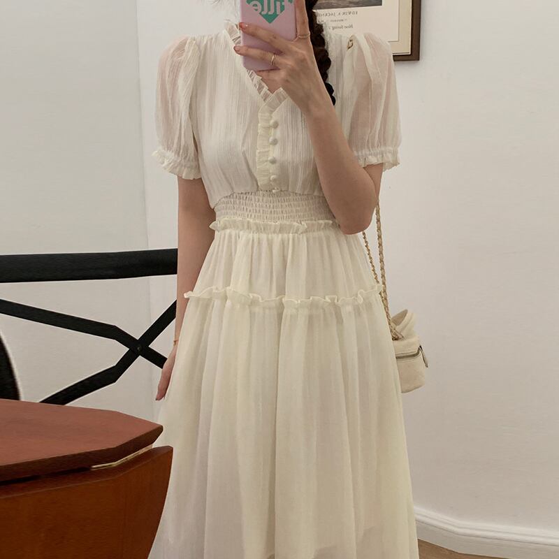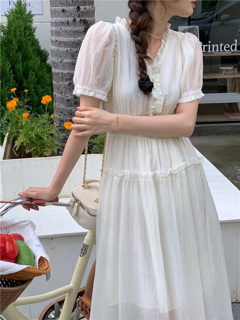 サマーVネックウェストスリーブシフォンドレス 夏物 ステッチ 7/20 mi461008134120
