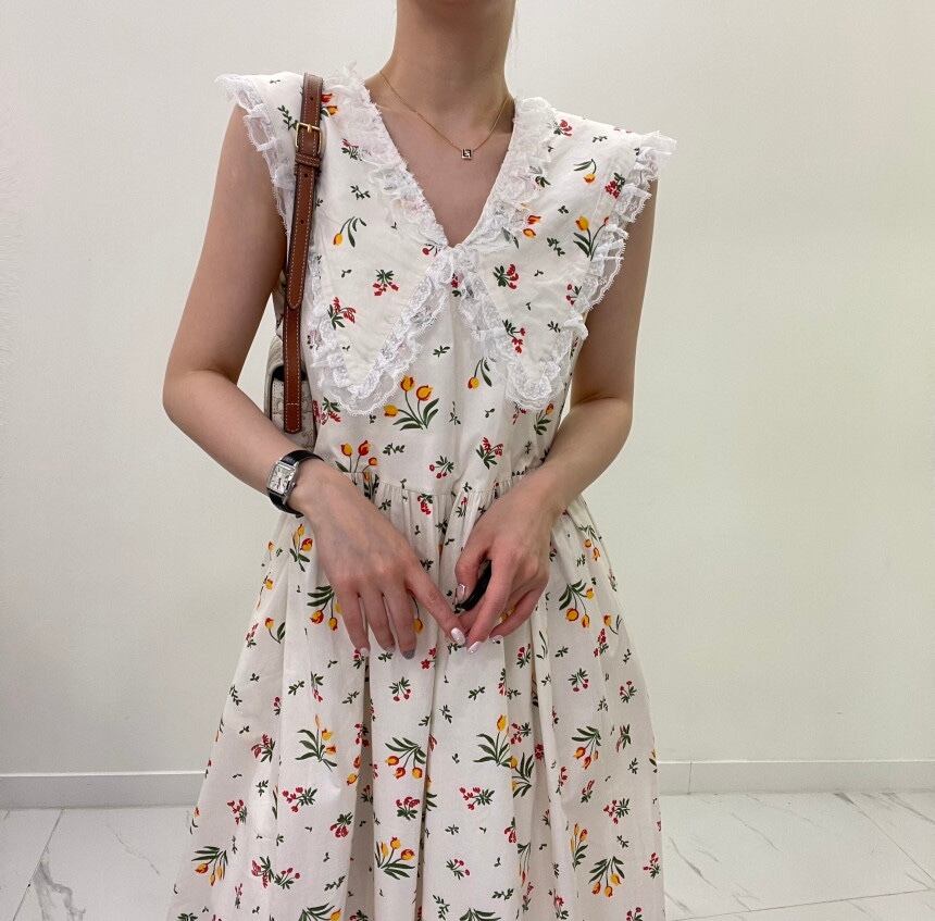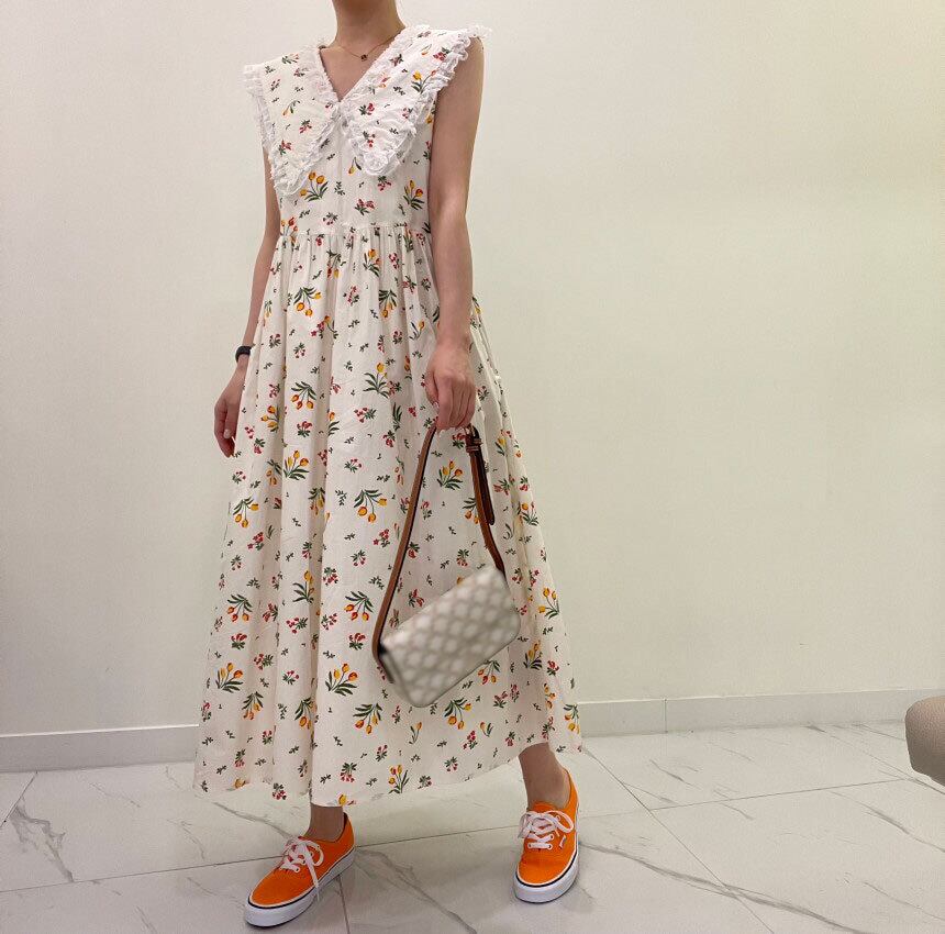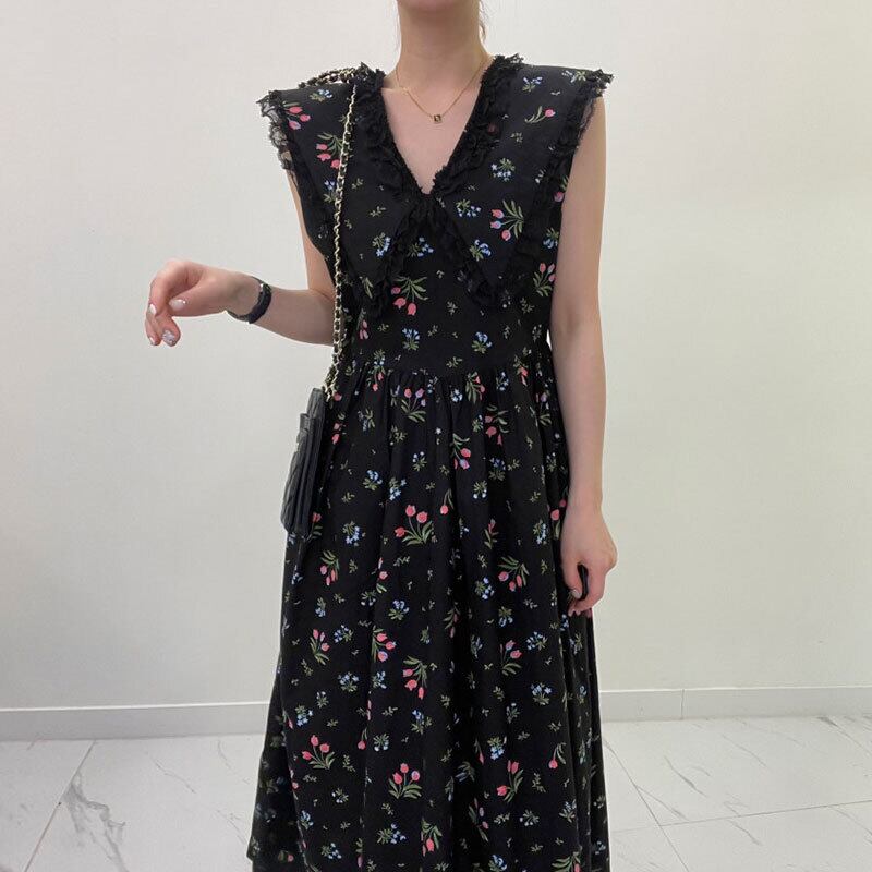 スタンダードカラーフローラルドレス サマールーズノースリーブロングスカート レトロ 夏物 花柄 7/20 mi4679093865316