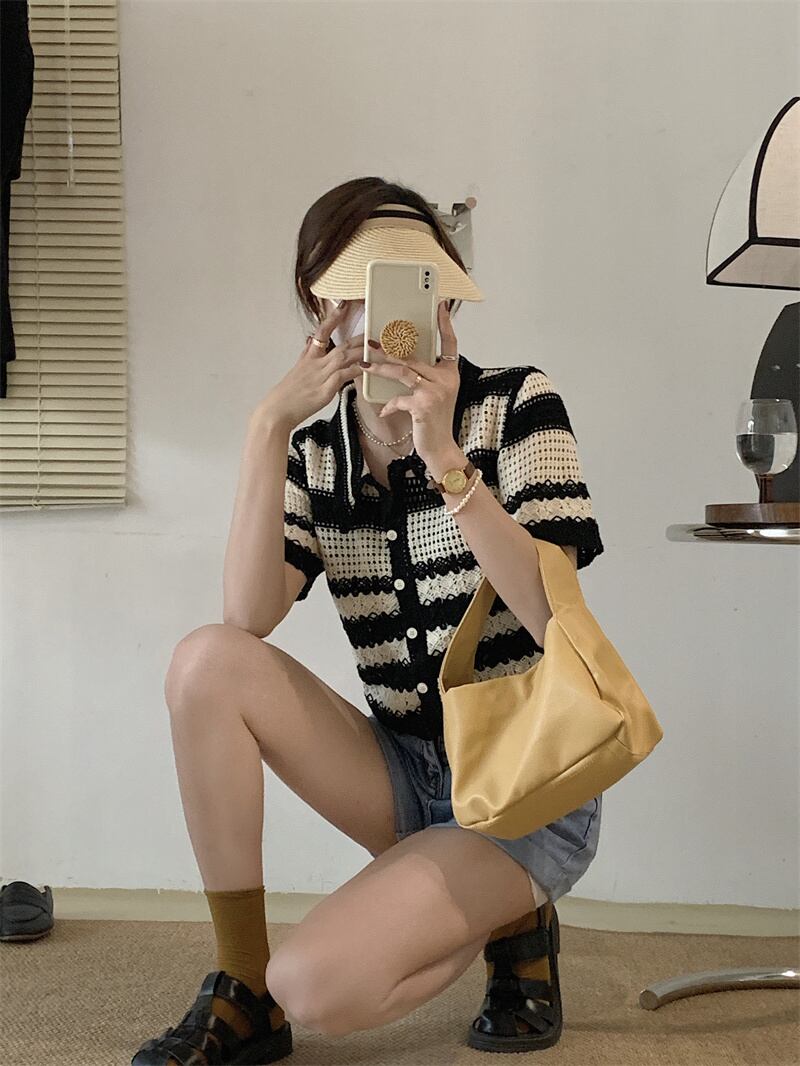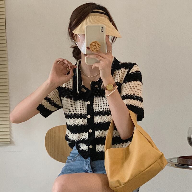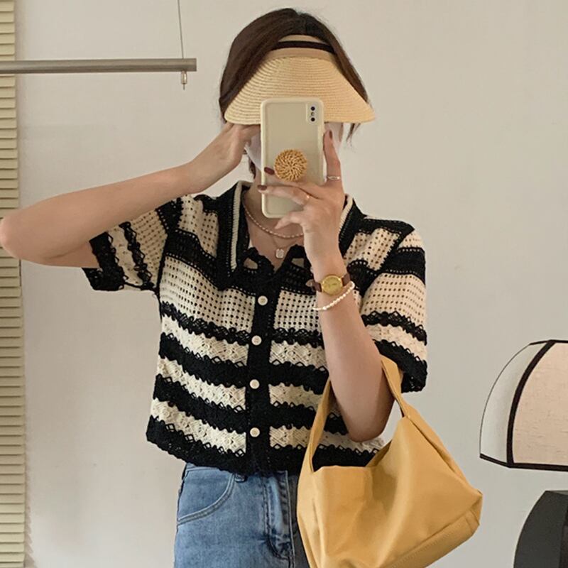サマースタンダードレースジャカードルーズストライプセーター レトロ 夏物 7/20 mi4681327520641