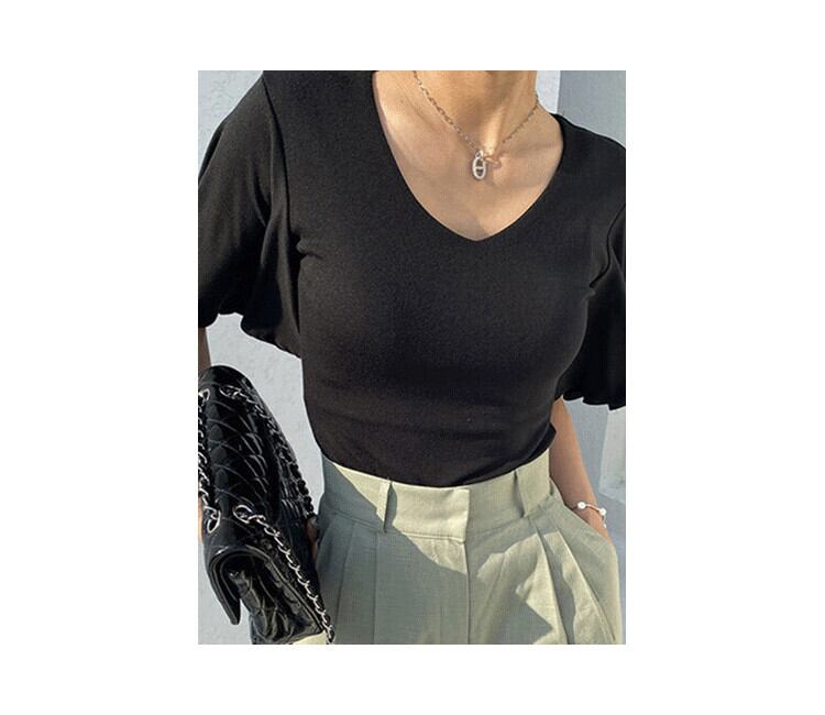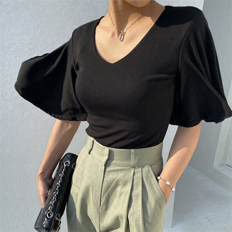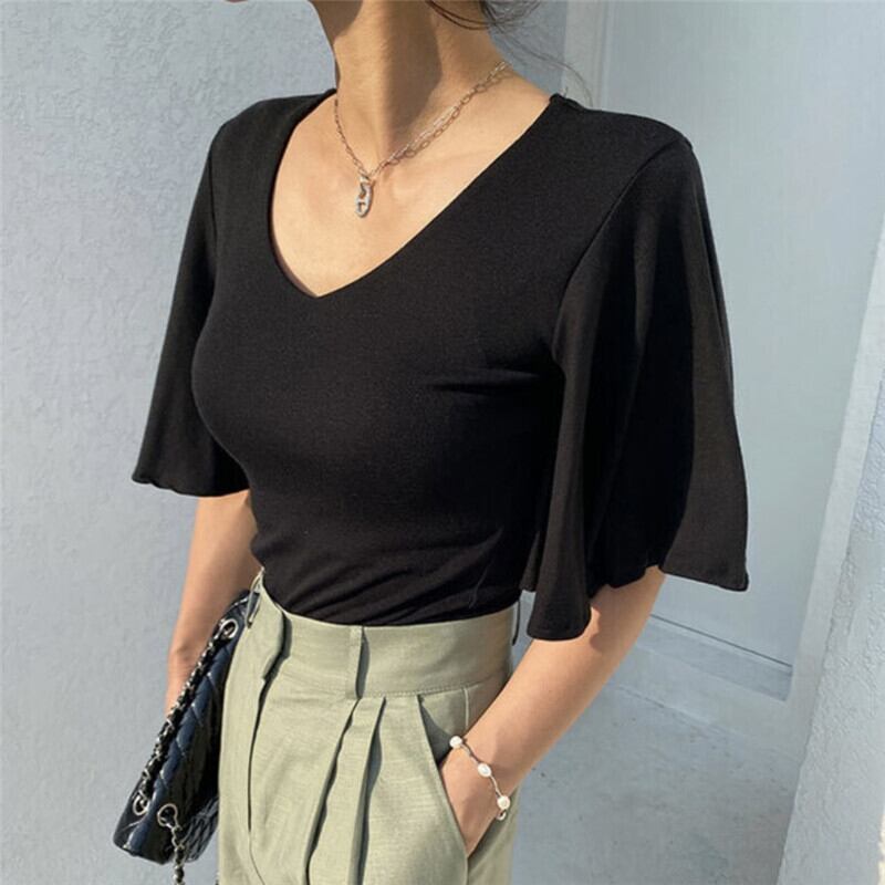 サマーVネックスリムフィットソリッド カラーシャツ トップス レディース 夏物 ソリッドカラー 7/20 mi4654407729458