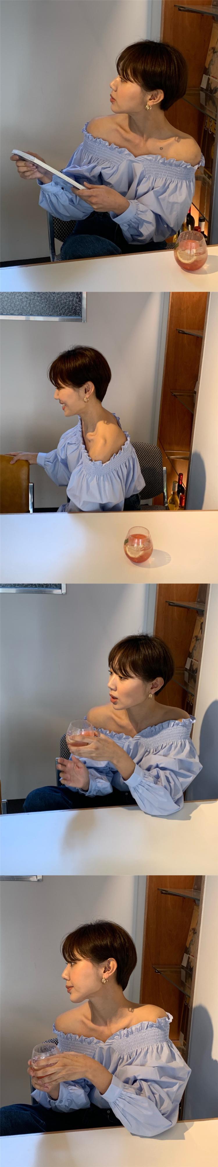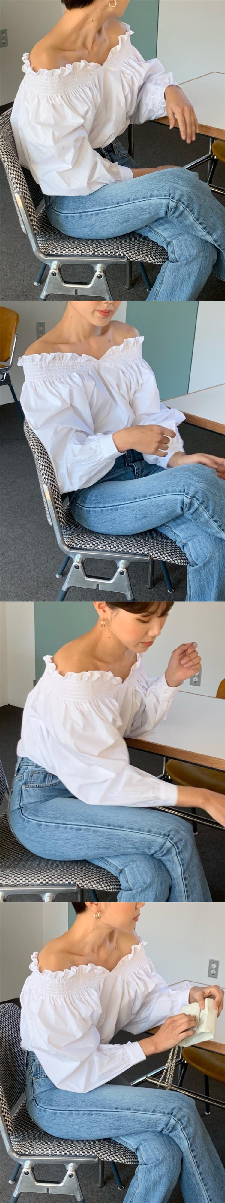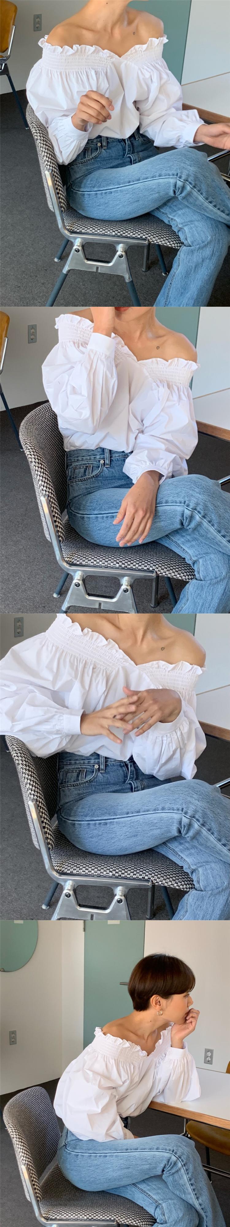 オータムブルーホワイトカラーストラップレスバックスリーブシャツ レディース ランタンスリーブ 秋物 7/20 mi4680909453106
