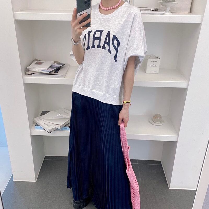 スタンダードラウンドネックプリント柄ルーズプリーツドレス ロングスカート レトロ Oネック ステッチ 7/20 mi4612983441026