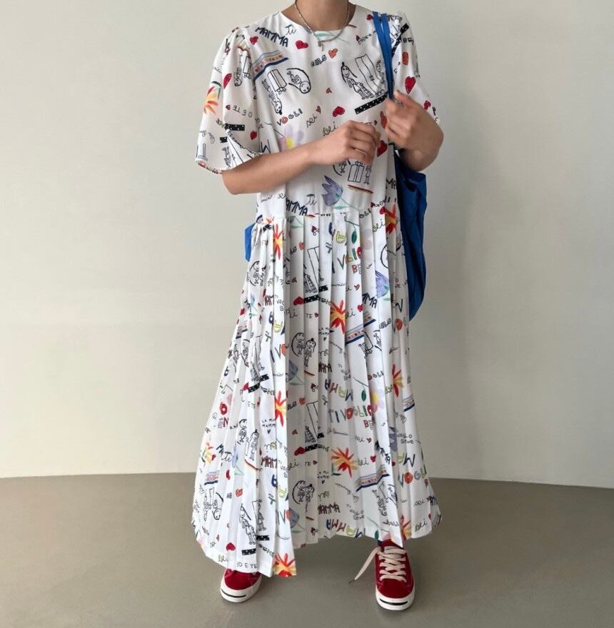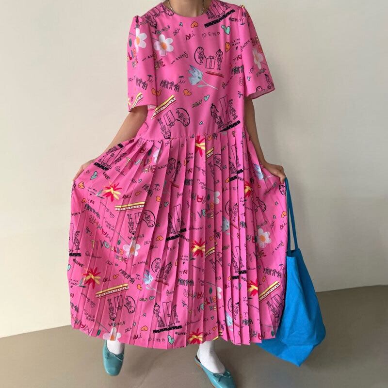 サマーラウンドネックプリント柄プリーツドレス ロングスカート 夏物 Oネック ステッチ 7/20 mi4616820704451