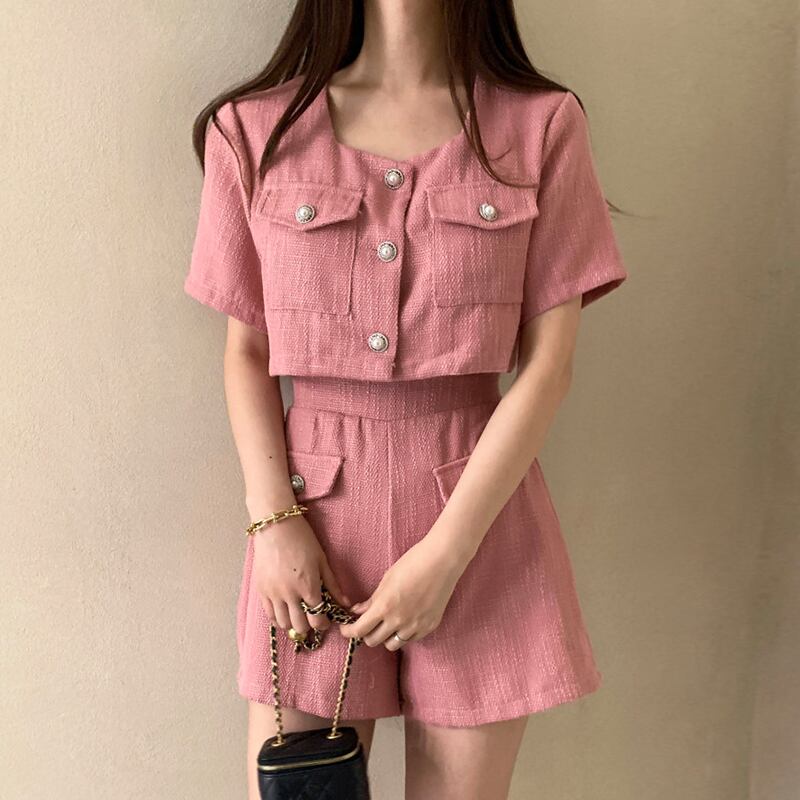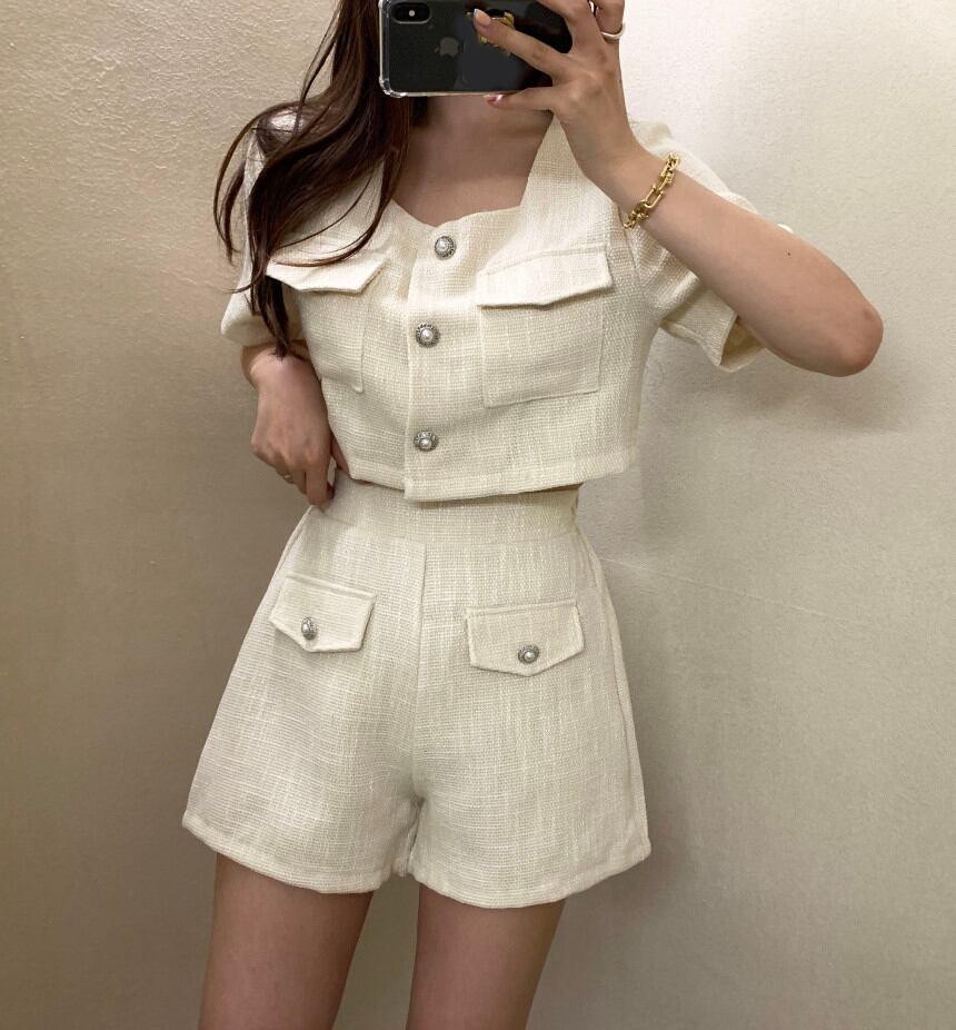 サマースタンダードカラーショートシャツ ハイウェストウェストルーズショーツ レディース レトロ 夏物 ブルマー スクウェア 7/20 mi4679082061369
