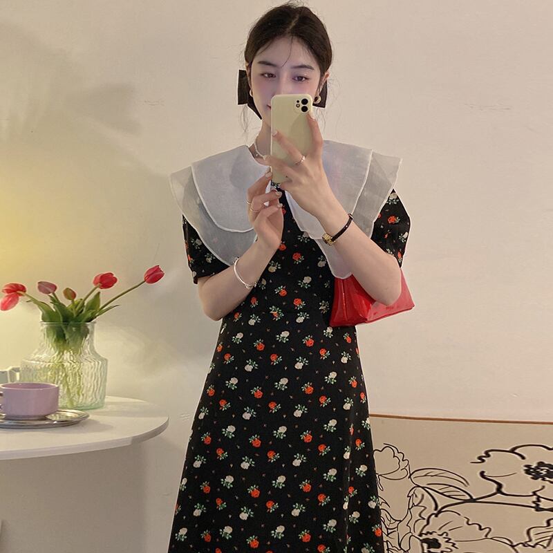 サマーFlowerデザイン ウェストスリムスリーブロングドレス レッド 大人ガーリー スウィート キュート カジュアル 夏物 フラワーデザイン 7/20 mi4685634950797