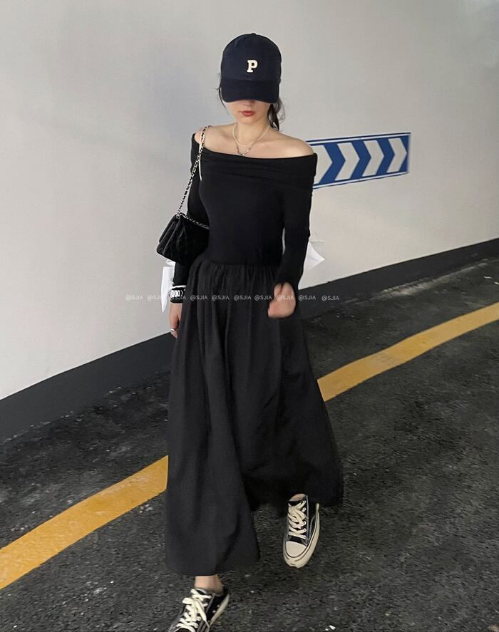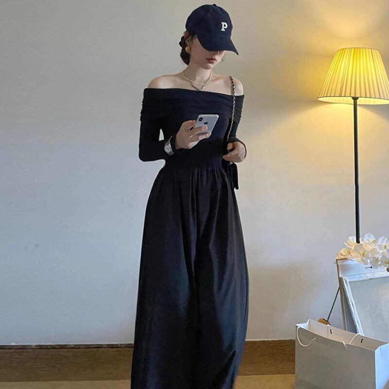 オータムスタンダードカラースリムフィットドレス ブラック ロング レトロ 秋物 7/20 mi4622639518664
