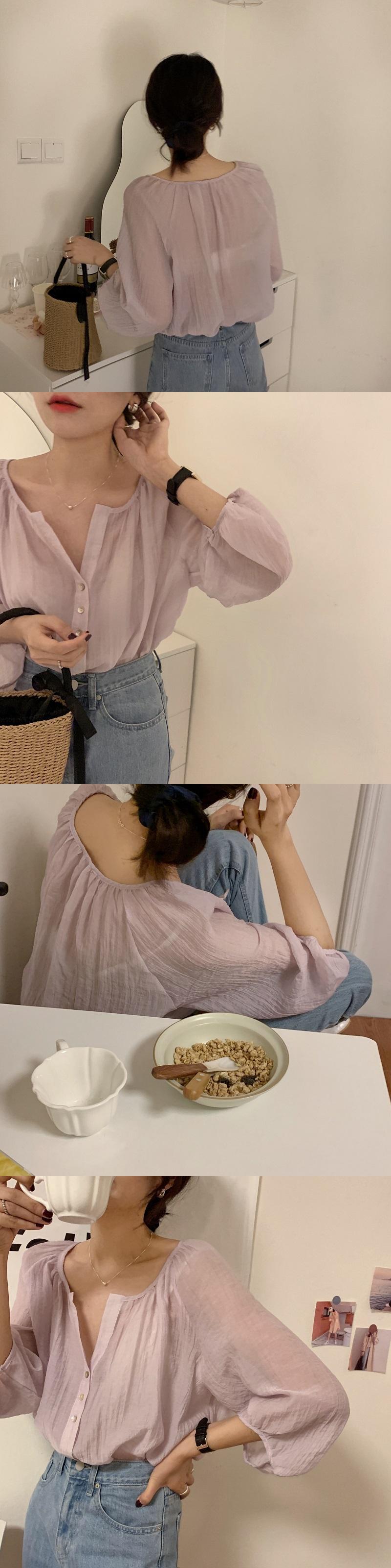 サマーラウンドネックボタンプリーツスリーブシャツ トップス レディース 夏物 Oネック 7/20 mi4638464388109