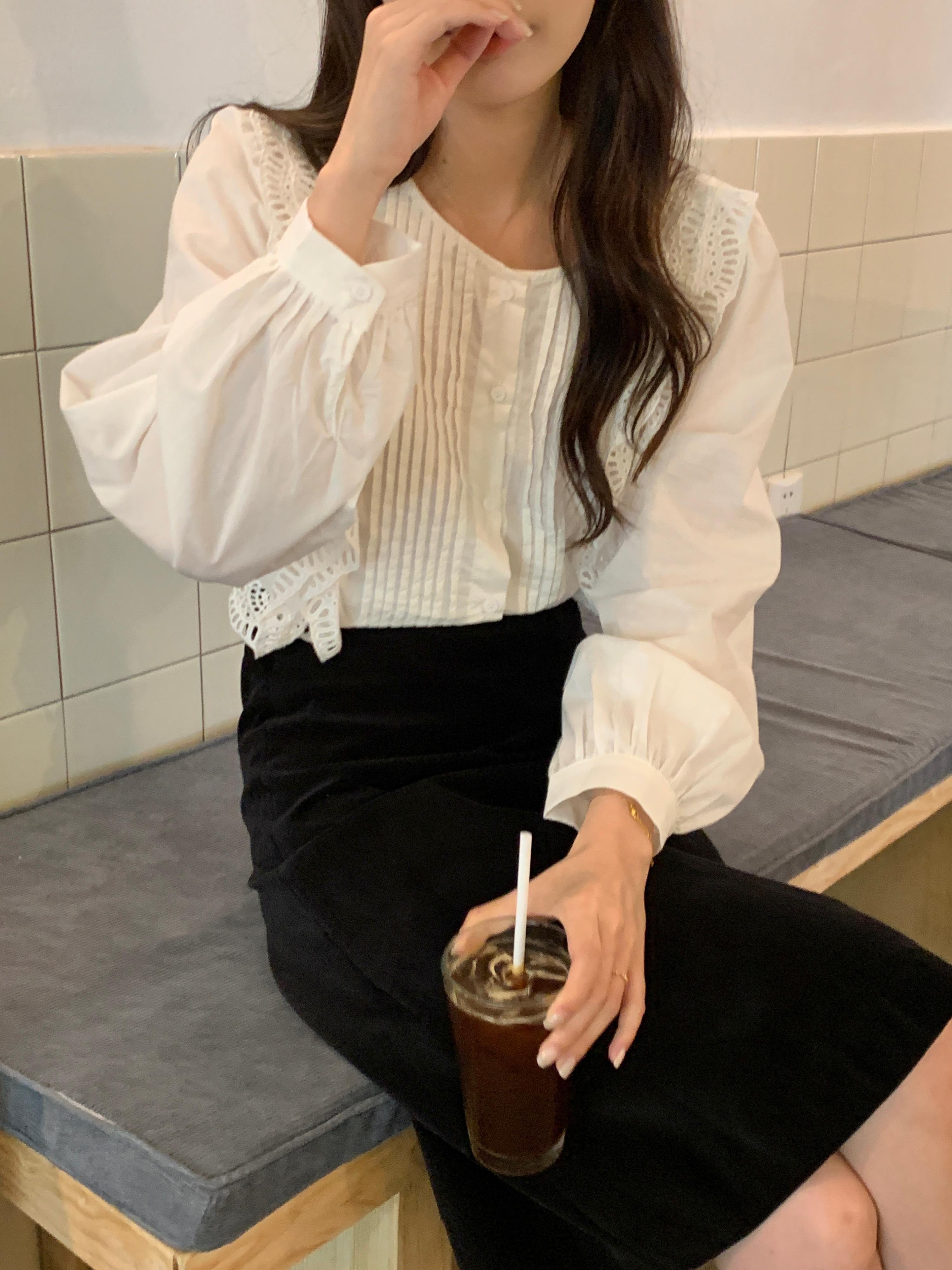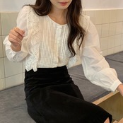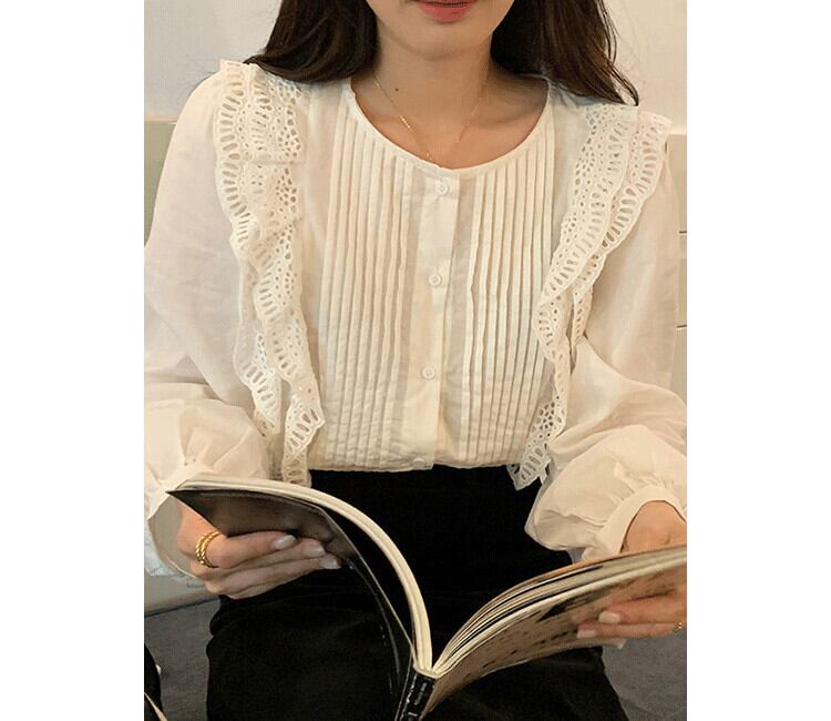 オータムラウンドネックプリーツレースシャツ レディース ロング 秋物 Oネック ステッチ 7/20 mi4667084584997
