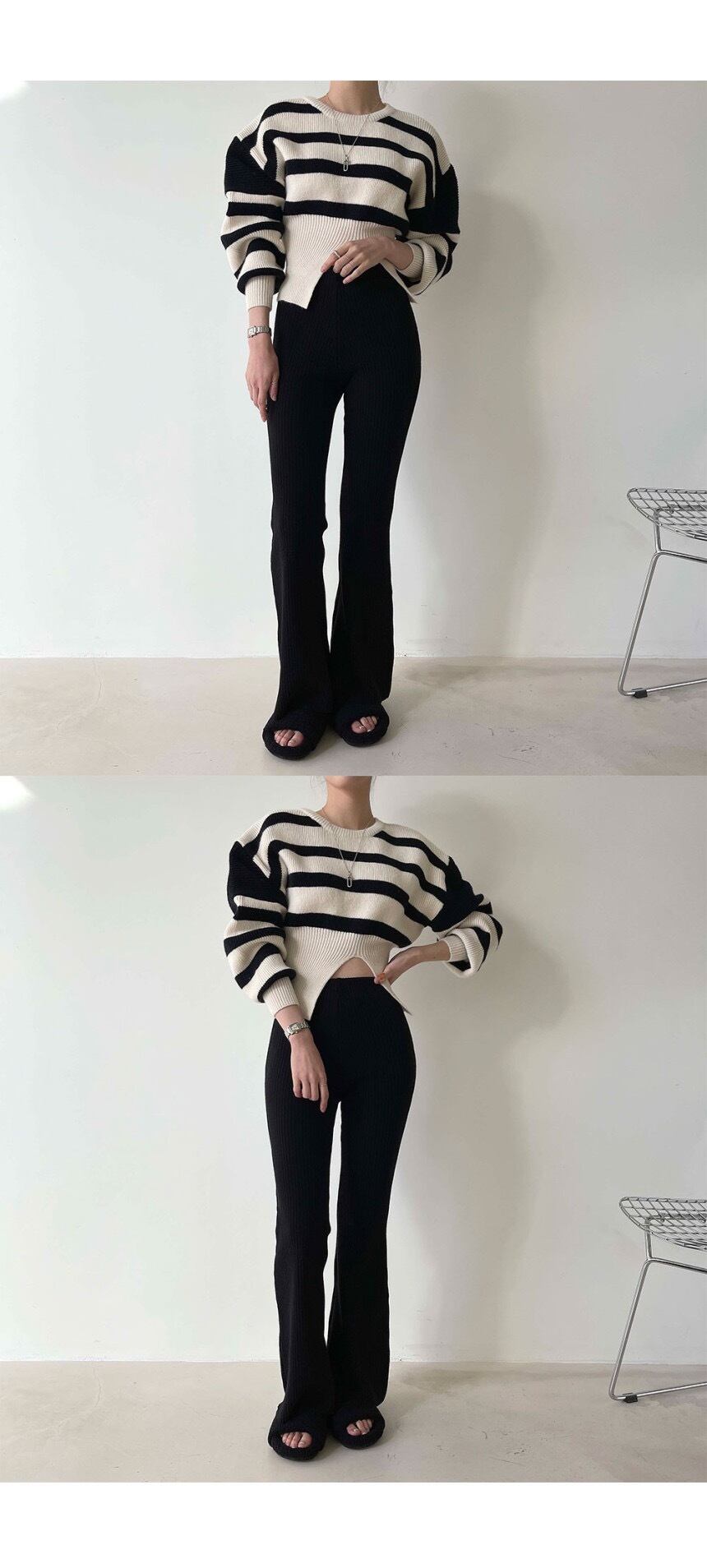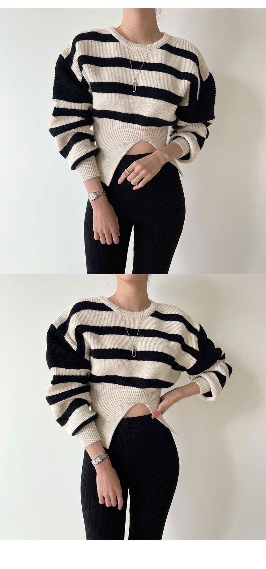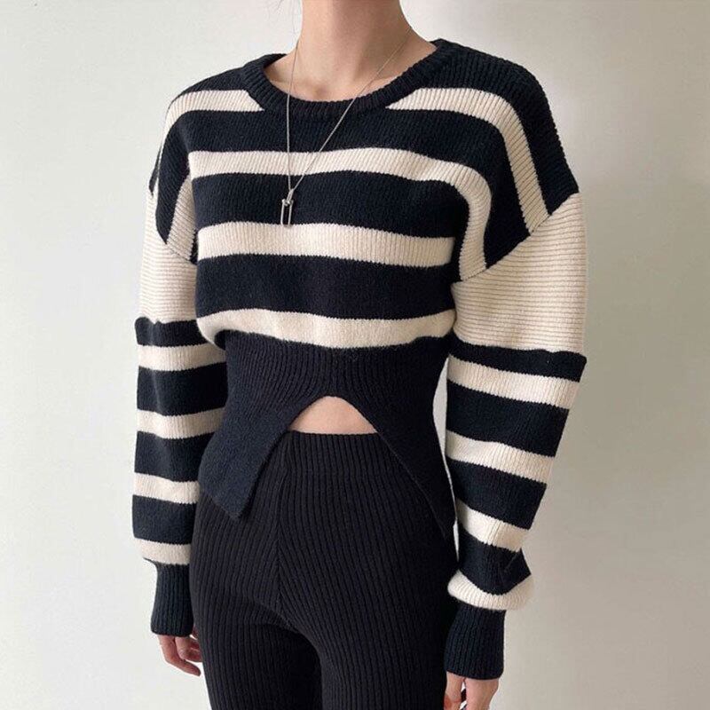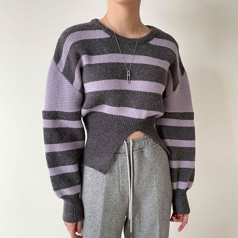 オータムスタンダードラウンドネックストライプスリットプルオーバー ニットセーター レディース ロング レトロ 秋物 Oネック 7/20 mi4620658668156