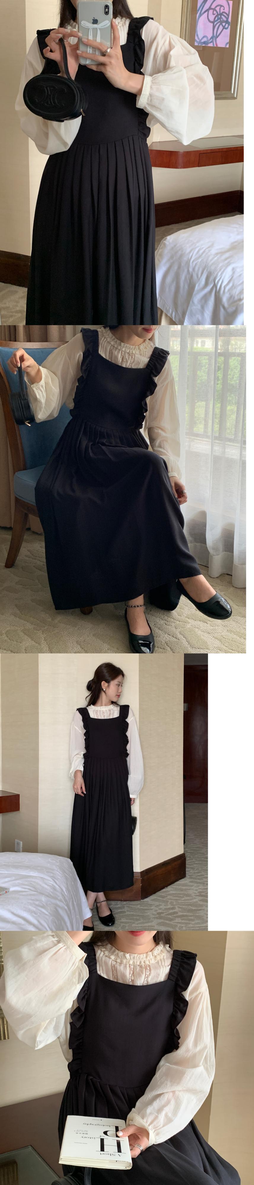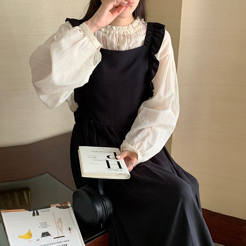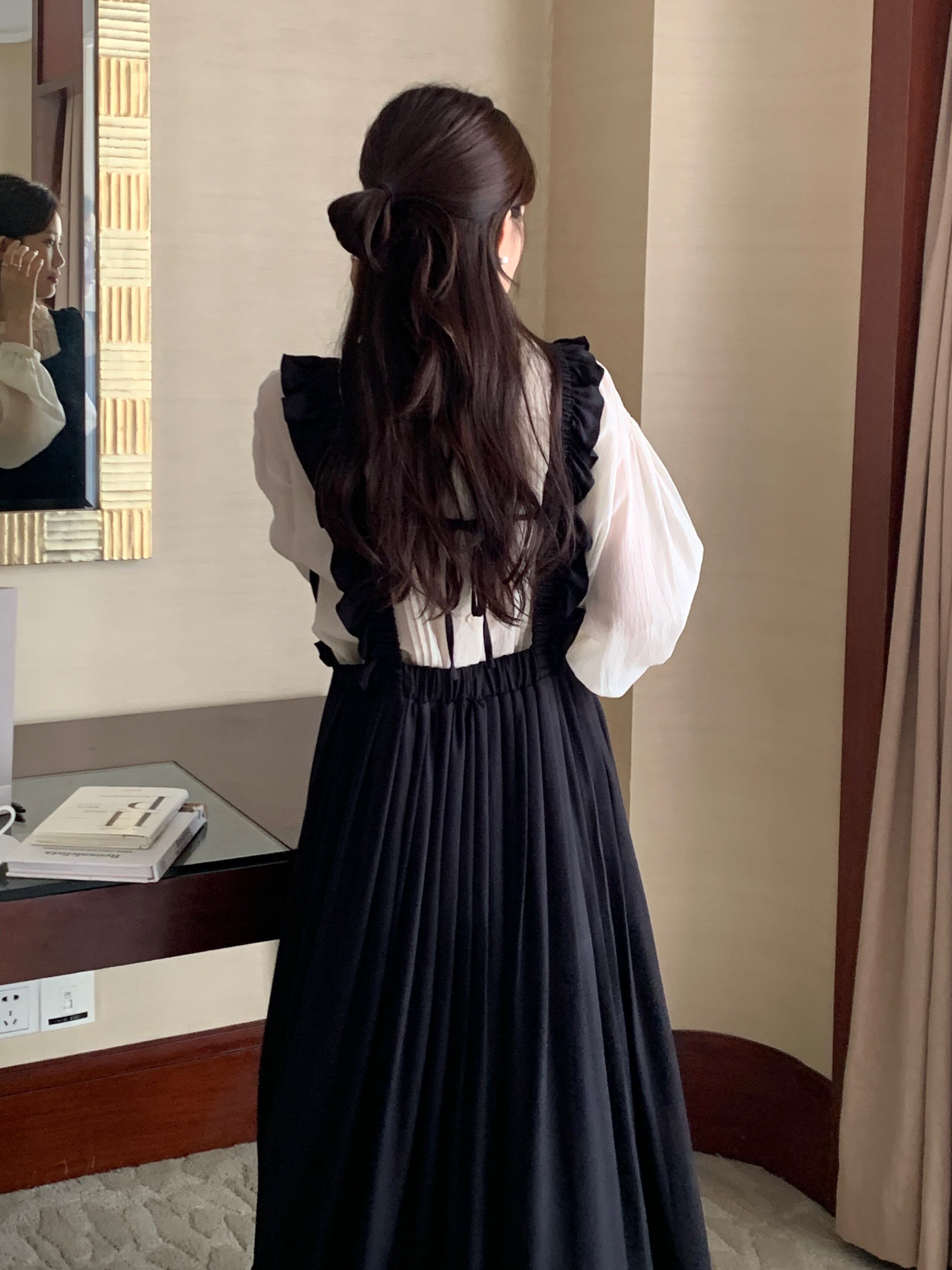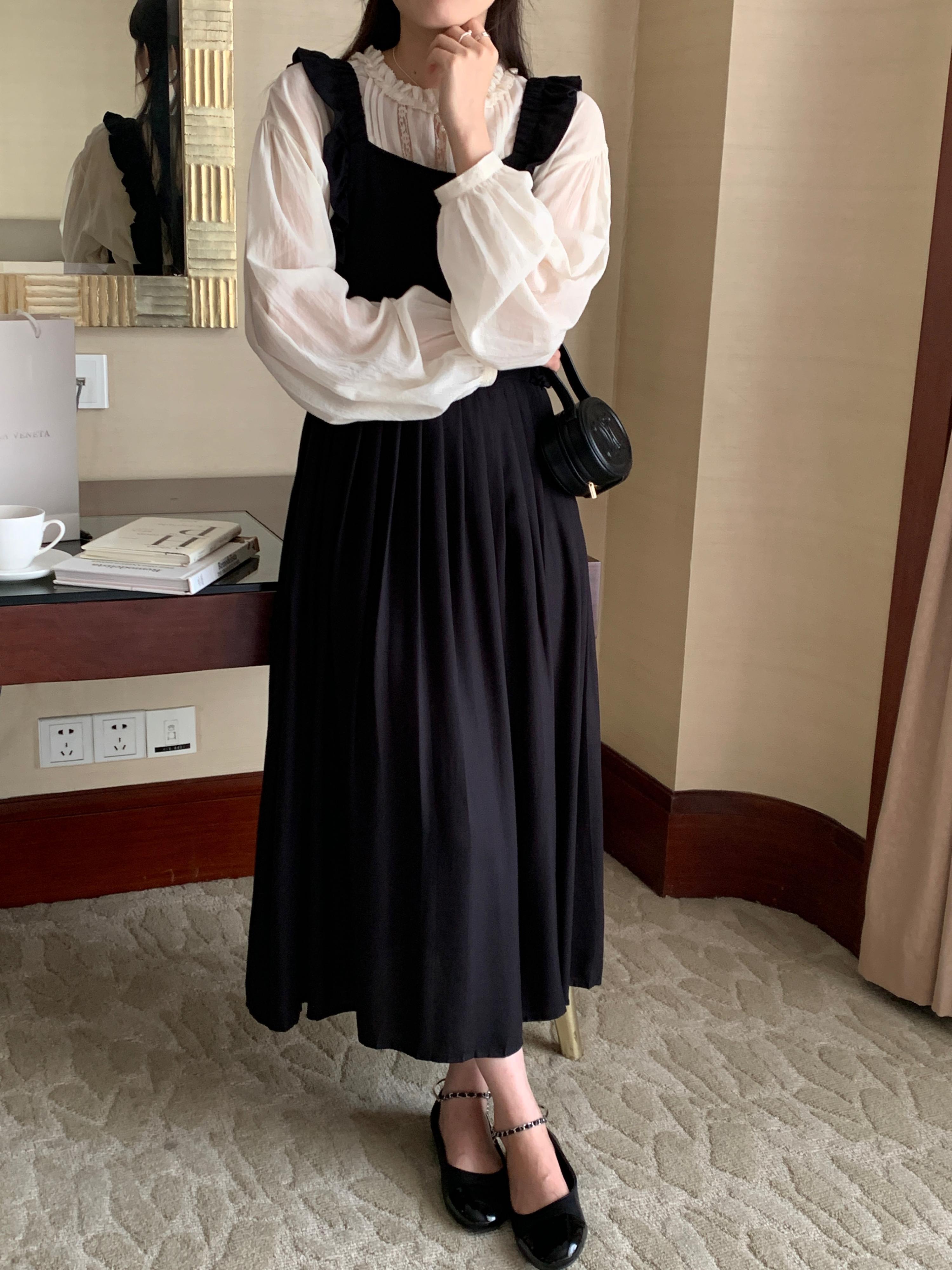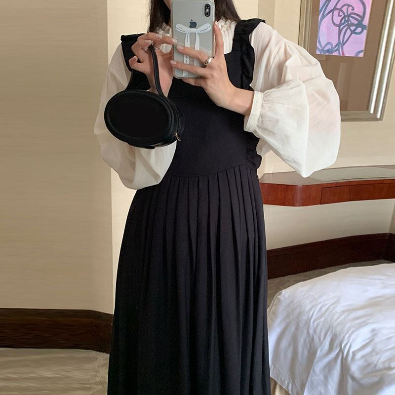 スタンダードラウンドネックシャツ ウェストスリムプリーツドレス ロング レトロ Oネック 7/20 mi4644539845246