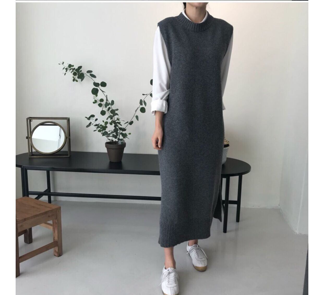 オータムラウンドネックソリッド カラールーズカジュアルサイドスリットニットドレス ロングスカート 秋物 Oネック ソリッドカラー 7/20 mi4659803956262