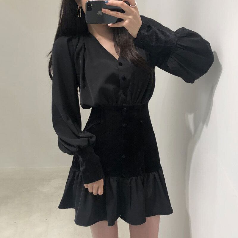 オータムVネックベルベットスリーブAラインドレス ランタンスリーブ エレガント 秋物 ステッチ 7/20 mi4626030555869