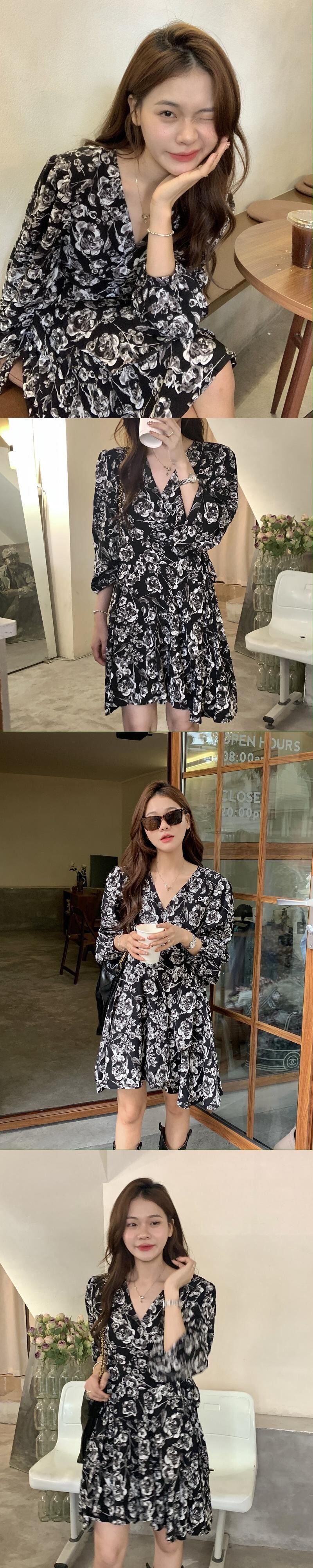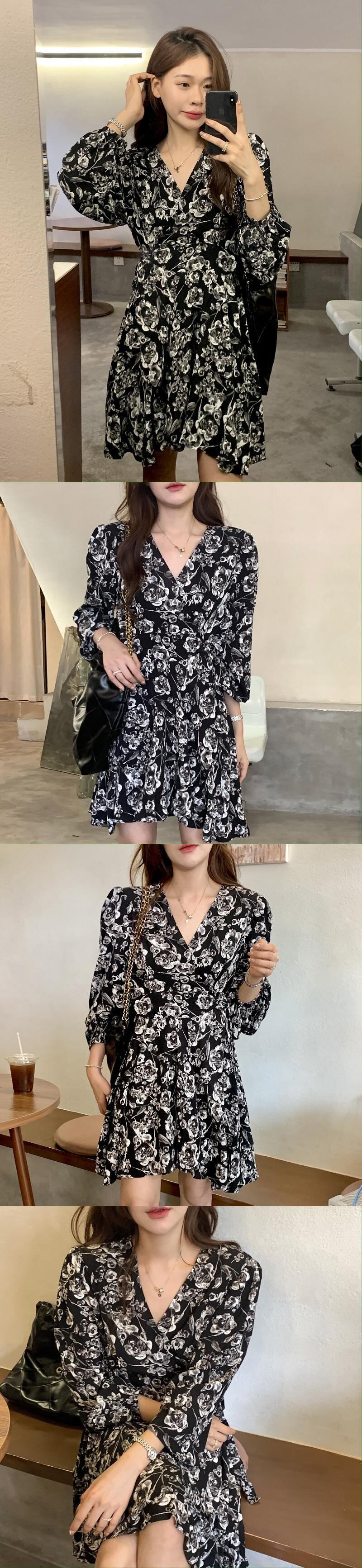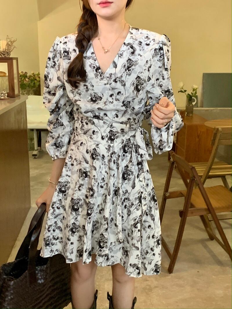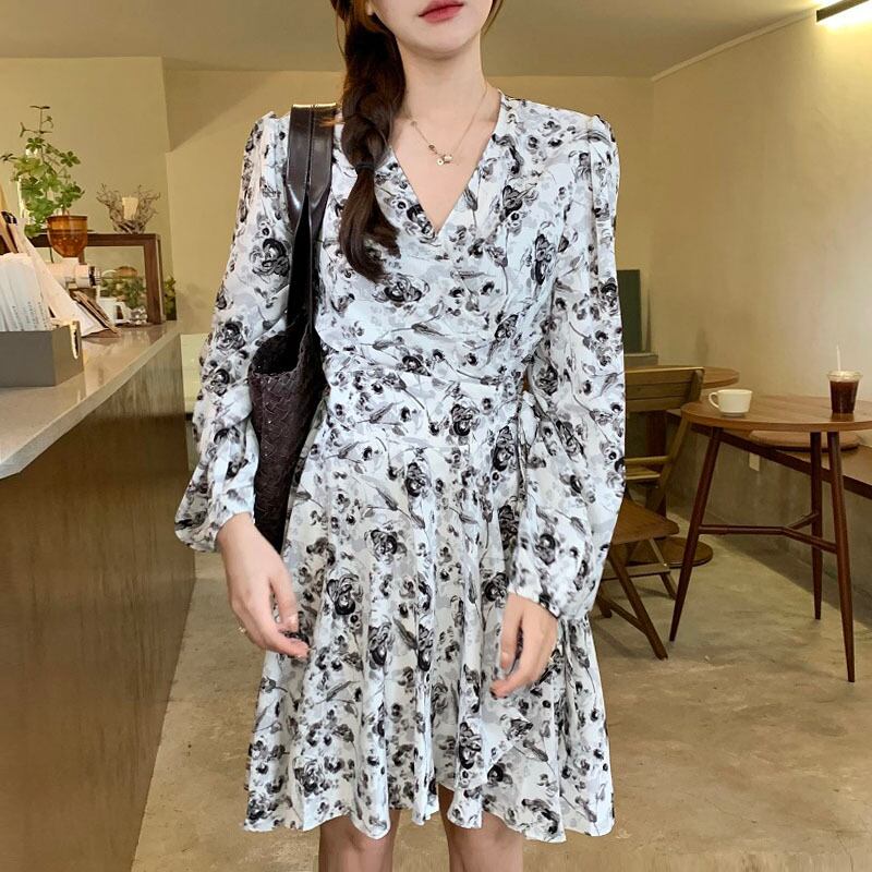 オータムスタンダードVネックFlowerデザイン プリント柄ワンピースウェストドレス ショートスカート ロング レトロ 秋物 フラワーデザイン 7/20 mi469795846174
