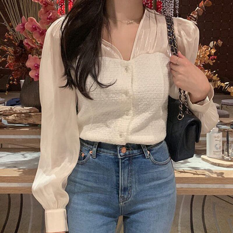 オータムVネックメッシュルーズシャツ レディース 秋物 ステッチ 7/20 mi464496812114