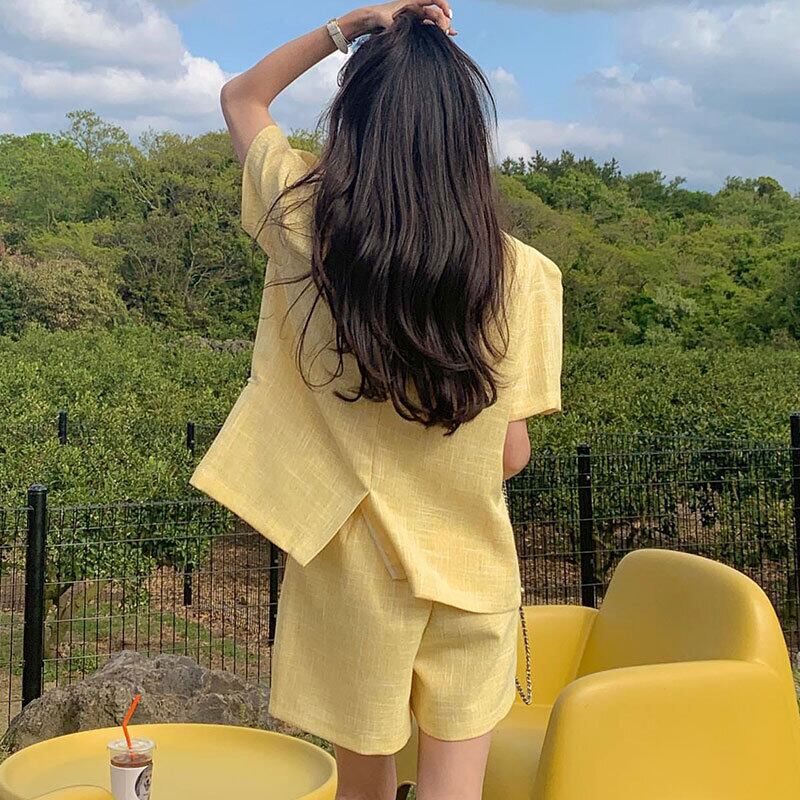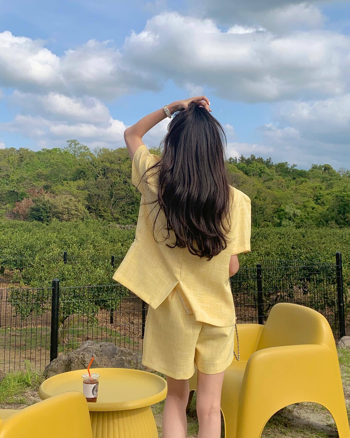 サマーイエローカラーボタンショートジャケット ハイウェストウェストツィードワイドレッグショーツ 夏物 ブルマー ワイドパンツ 7/20 mi464714044445