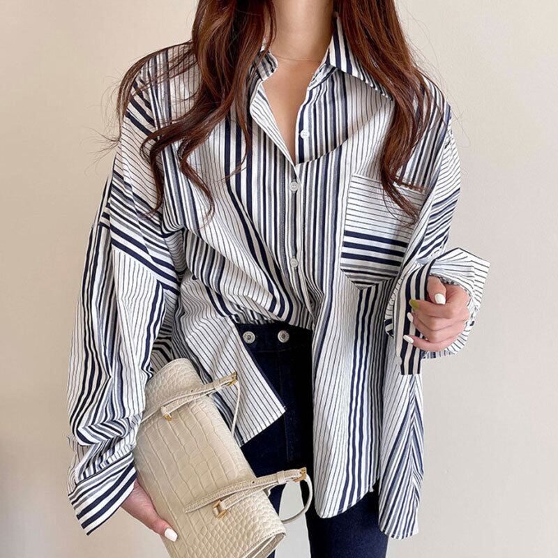 オータムスタイルスタンダードストライプルーズシャツ トップス ロング レトロ 秋物 7/20 mi4680860614277