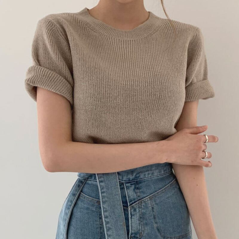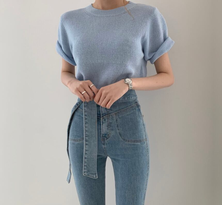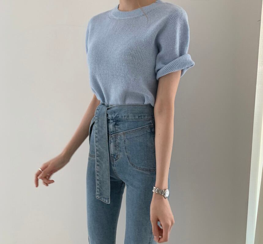 オータムブルーラウンドネックプルオーバー ルーズソリッド カラーニットセーター トップス レディース 秋物 Oネック ソリッドカラー 7/20 mi4677661570181