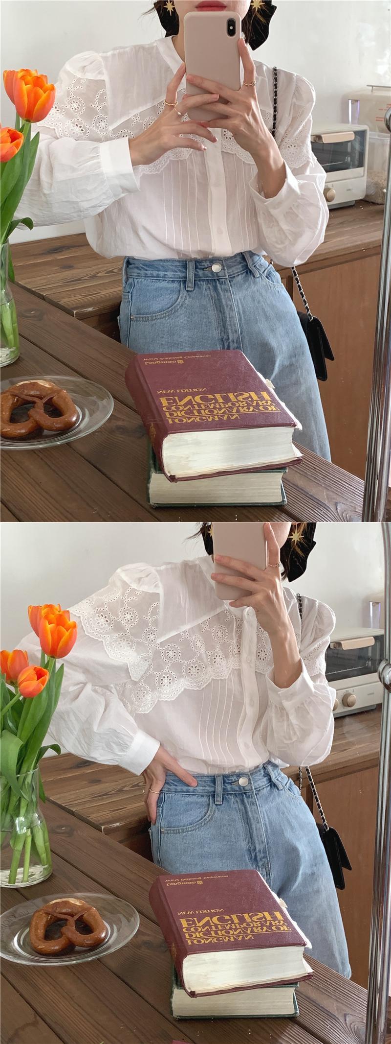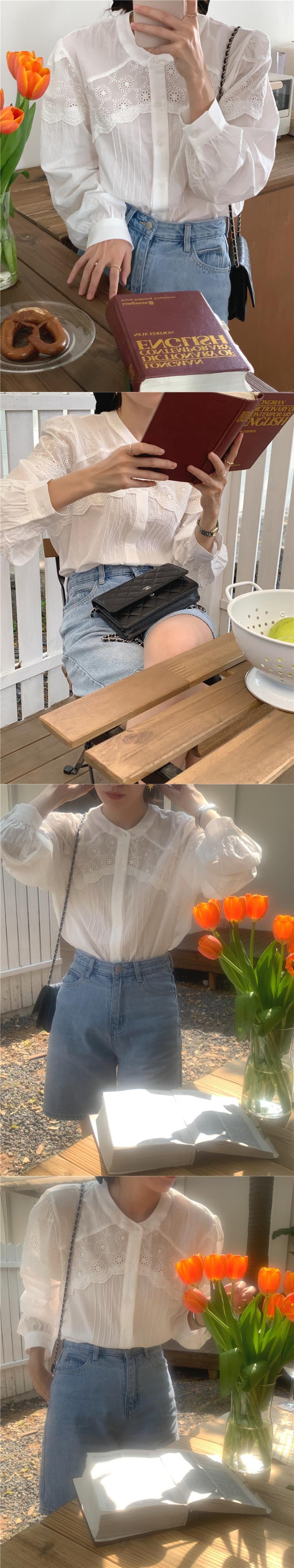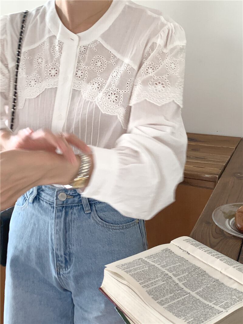 オータムラウンドネックレースFlowerデザイン プリーツルーズシャツ ロング 秋物 Oネック フラワーデザイン ステッチ 7/20 mi4620276137637