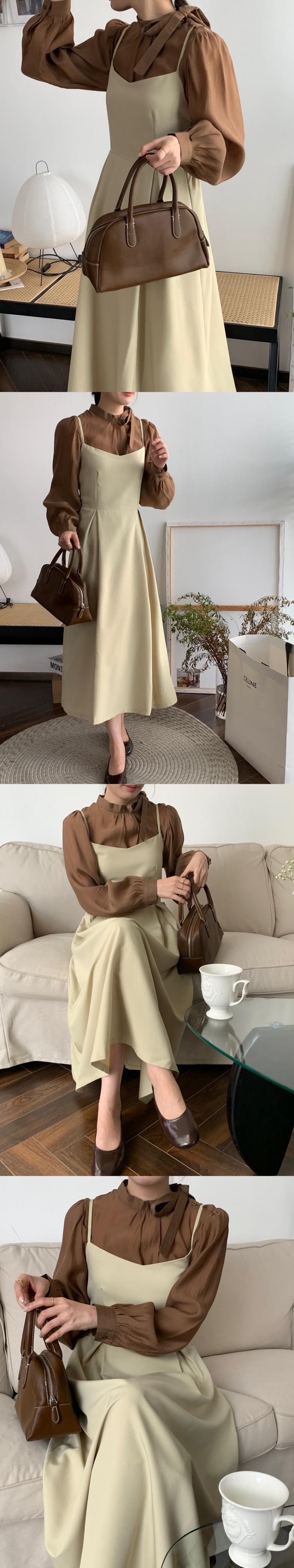 スタンダードスタンドカラーカラーリボンシャツ ホルターウェストドレス ロング レトロ スクウェア 7/20 mi4626771526764
