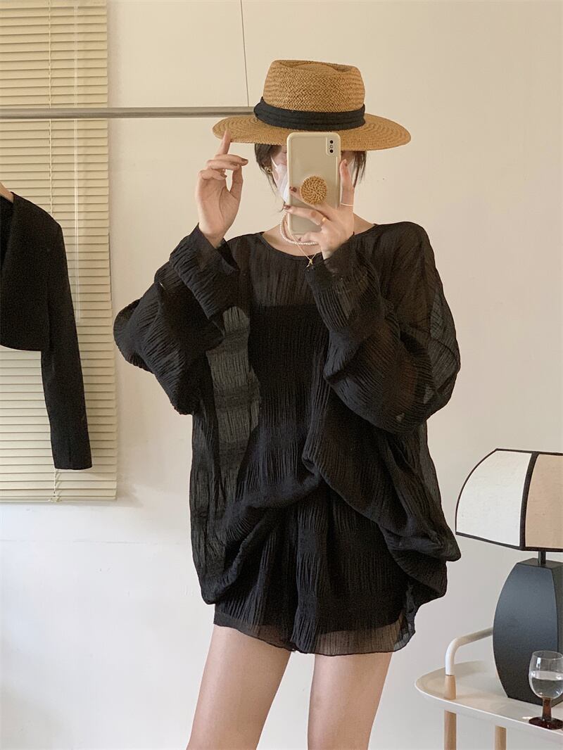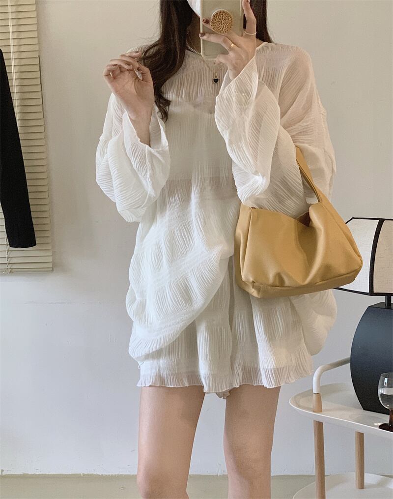 オータムラウンドネックルーズカジュアルシャツ ハイウェストウェスト薄手ショーツ レディース ロング 秋物 ブルマー Oネック 7/20 mi4697179048645
