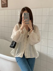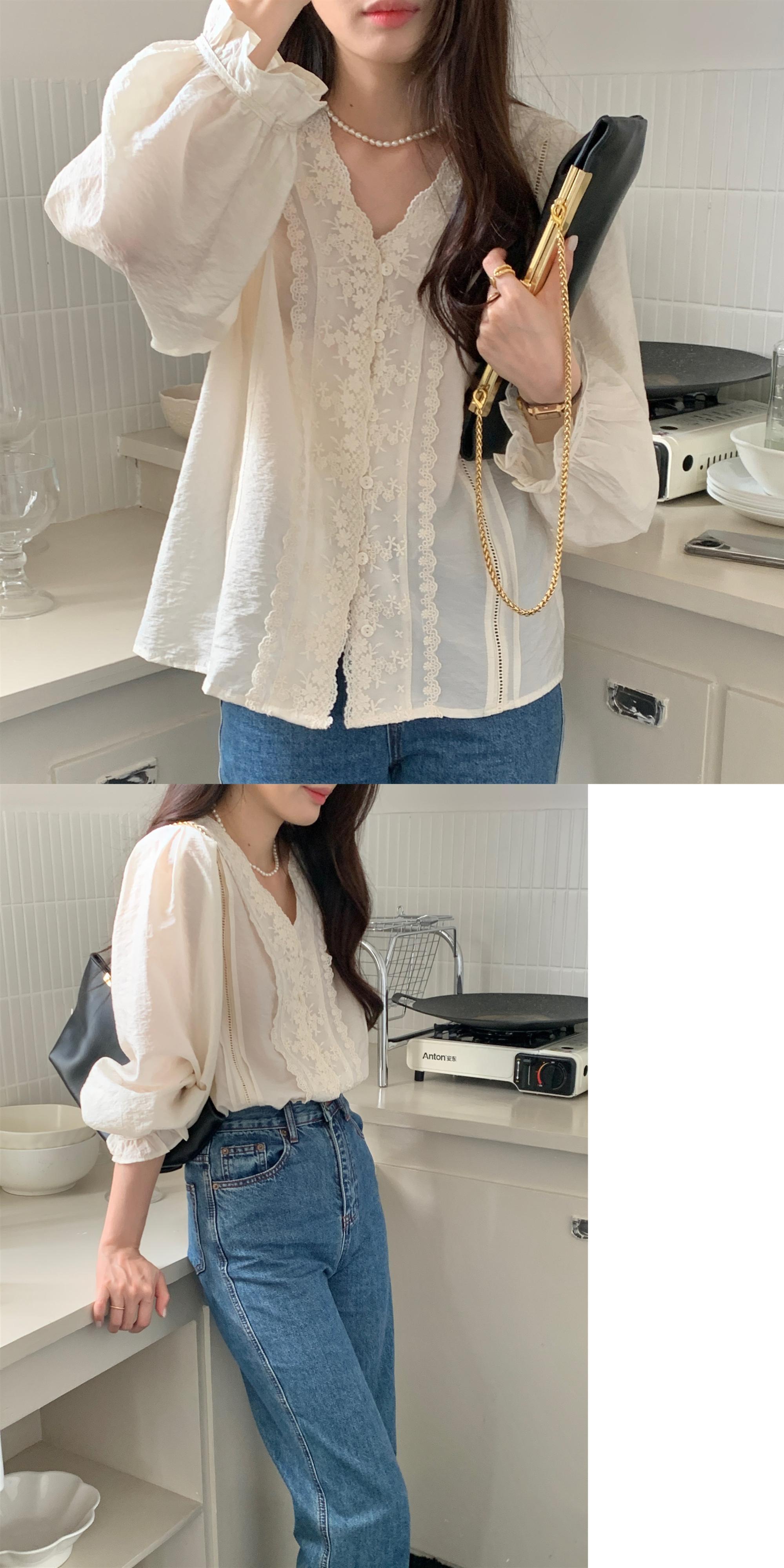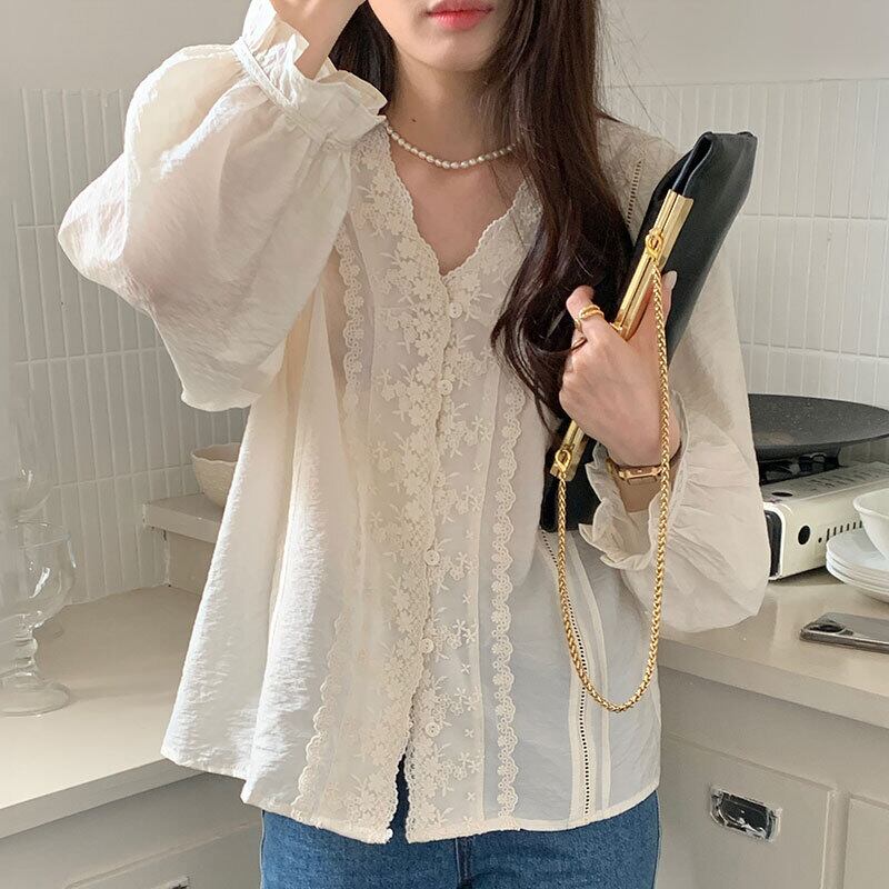 オータムVネックレーススリーブシャツ 大人ガーリー スウィート キュート カジュアル 秋物 ステッチ 7/20 mi4616493430579