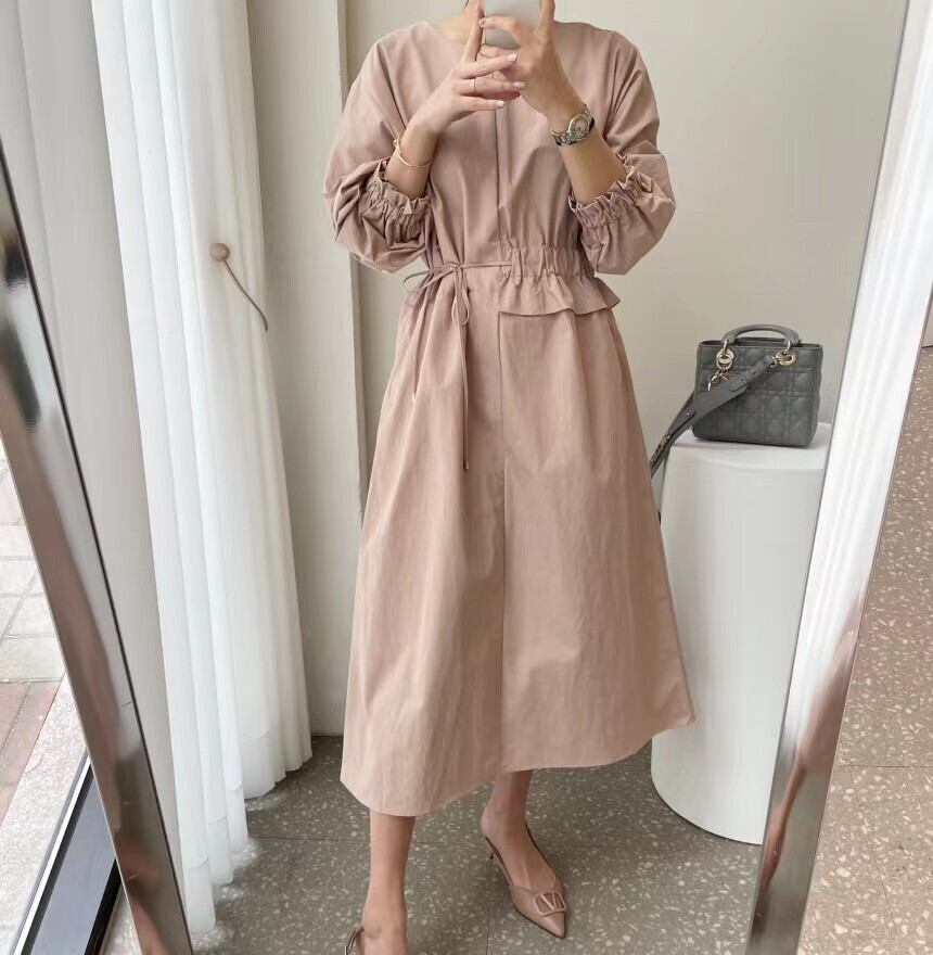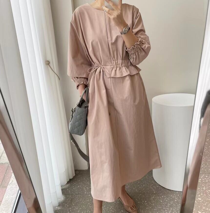 オータムラウンドネックギャザーウェストAラインドレス ロング エレガント 秋物 Oネック ステッチ 7/20 mi4653022161620