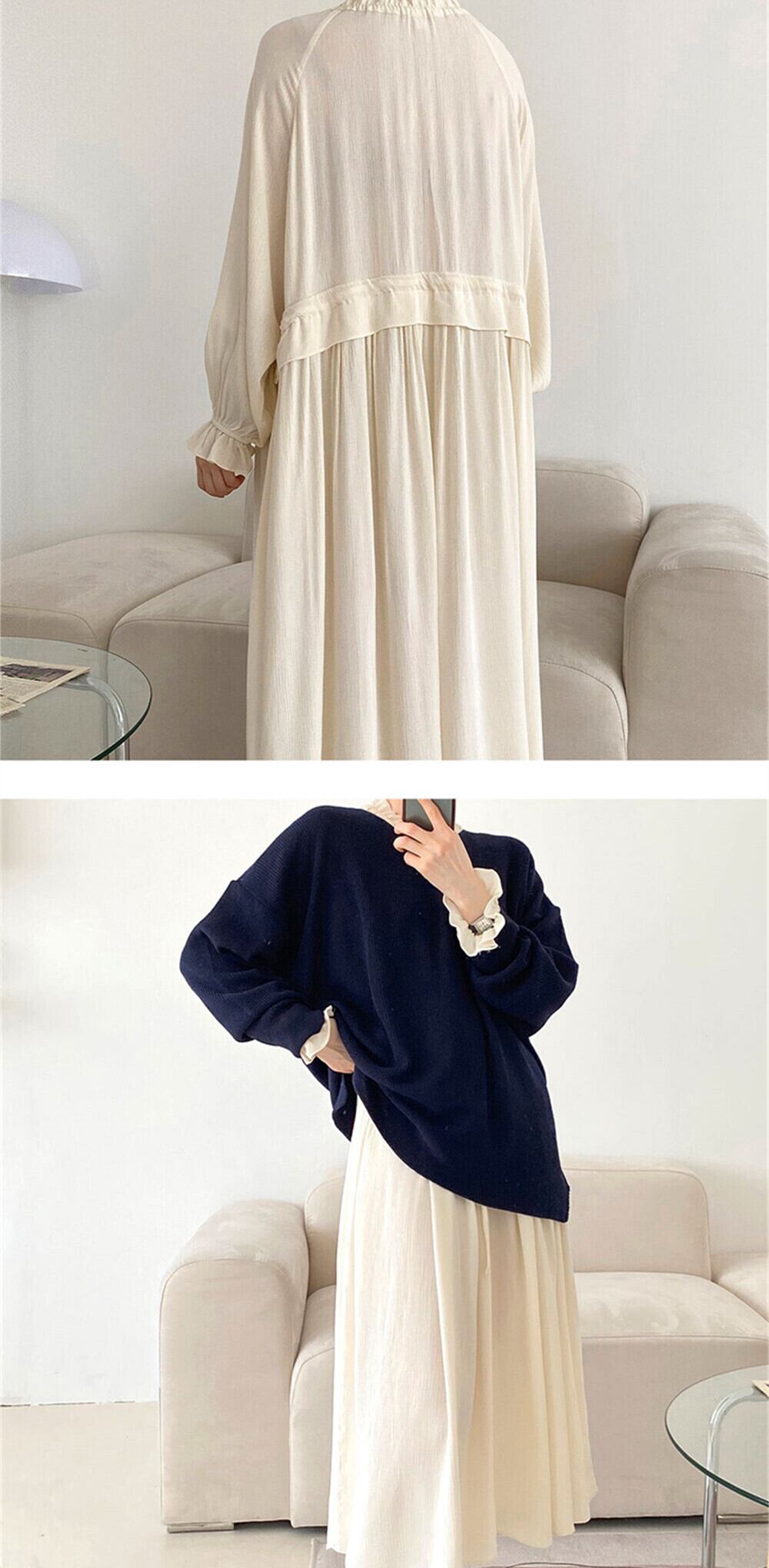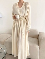オータムVネックギャザーウェストスリーブドレス エレガント 秋物 ステッチ 7/20 mi4654404836497