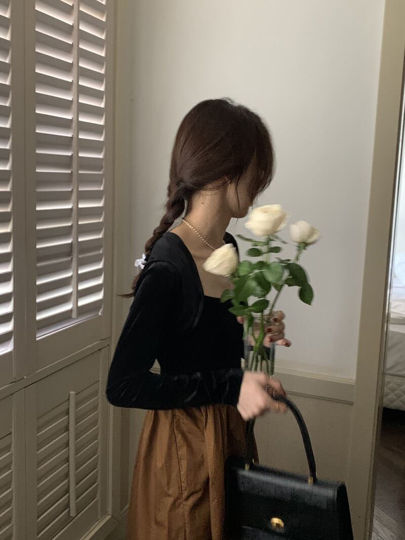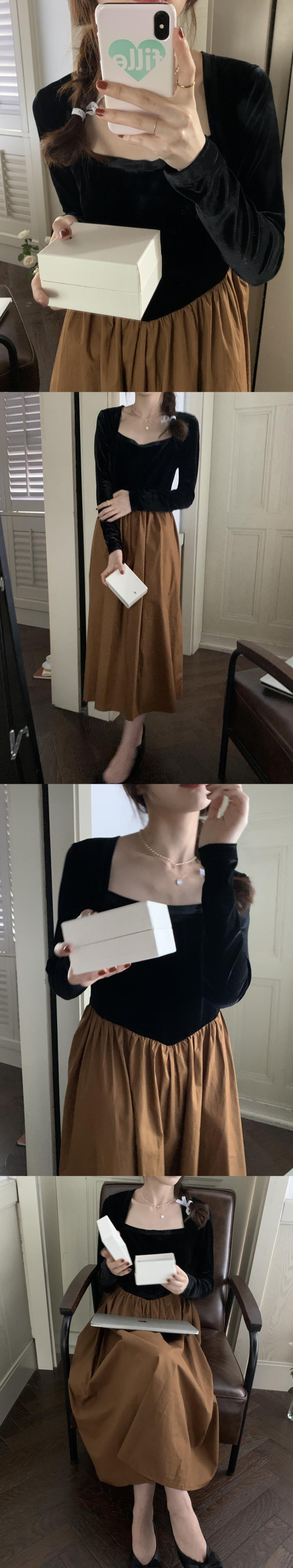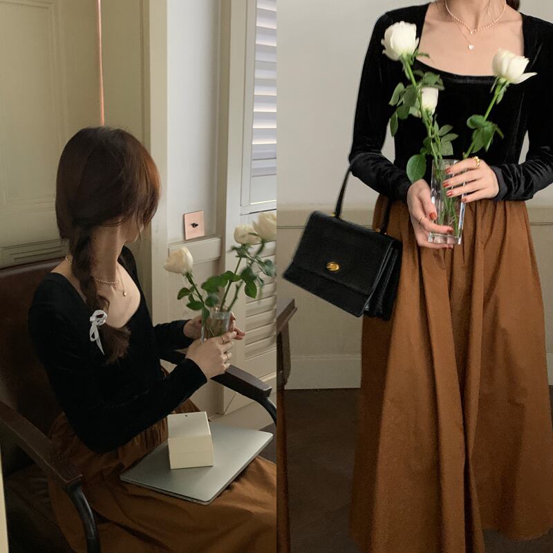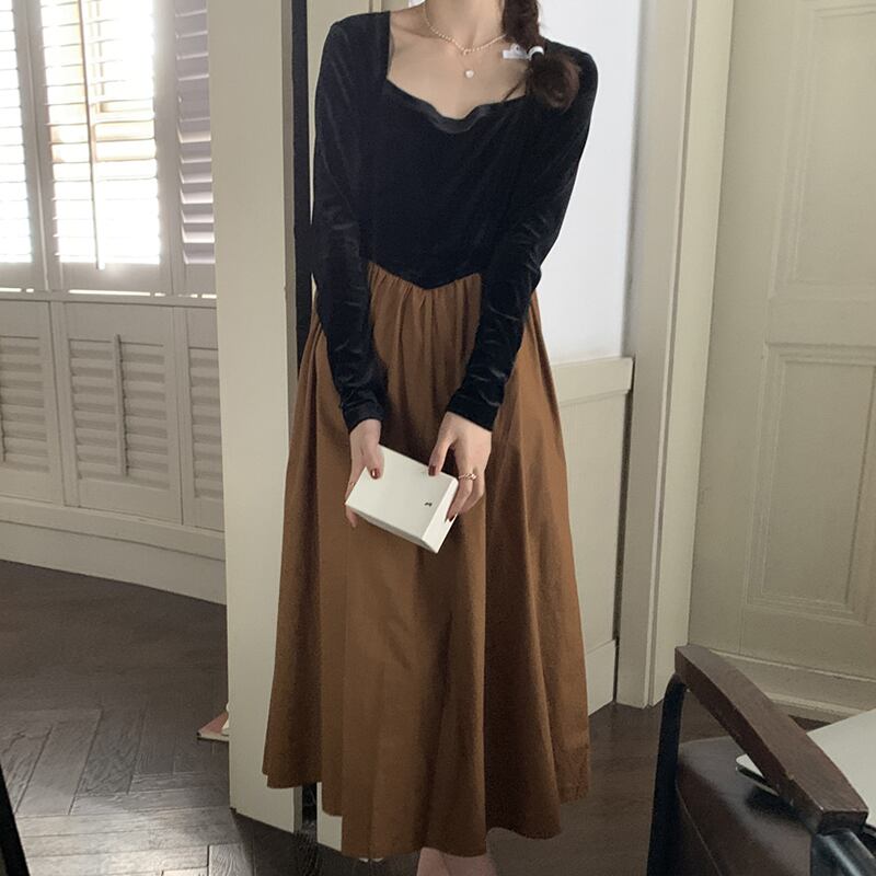 オータムスタンダードスタイルカラーウェストドレス レディース ロング レトロ 秋物 スクウェア ステッチ 7/20 mi4680769013480