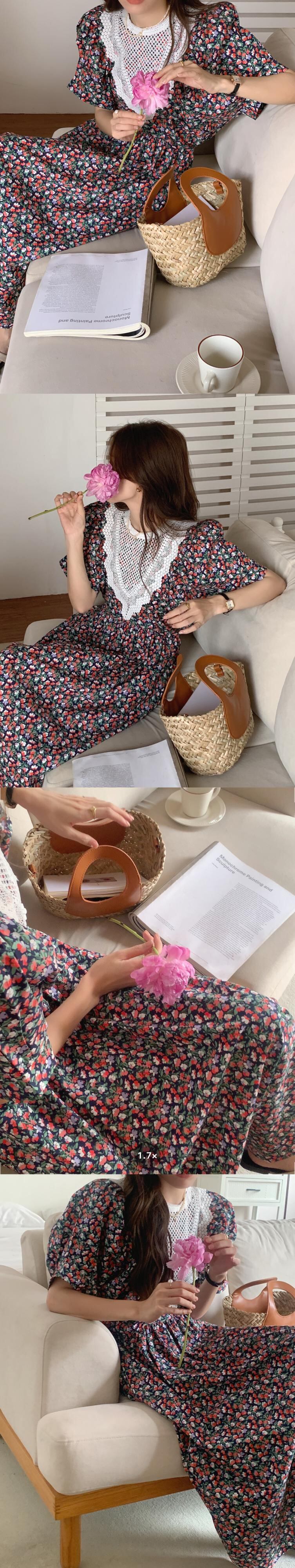 サマースタンダードラウンドネックレーススリーブフローラルドレス ロングスカート レトロ 夏物 花柄 Oネック ステッチ 7/20 mi462724452422