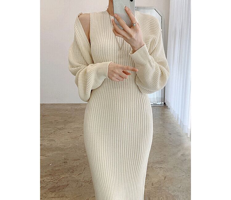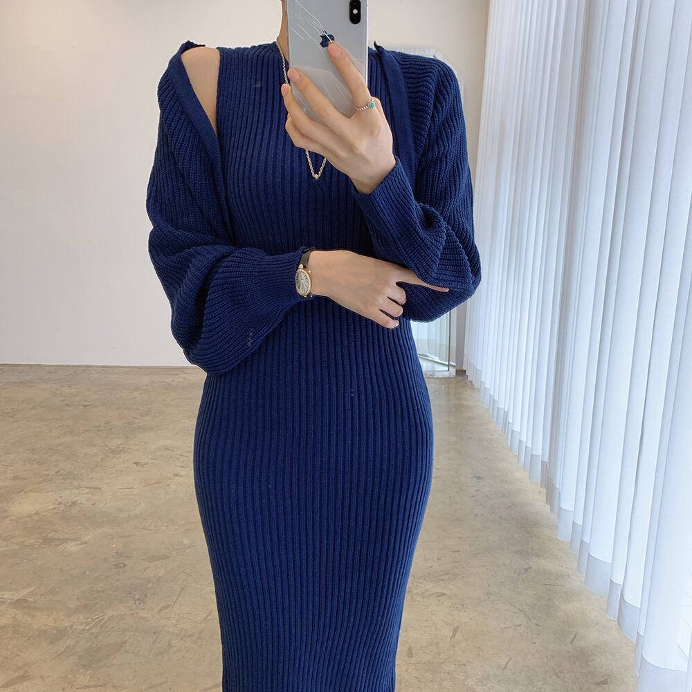 オータムラウンドネックスリムドレス ショートニット ロング 秋物 Oネック 7/20 mi4677978797543