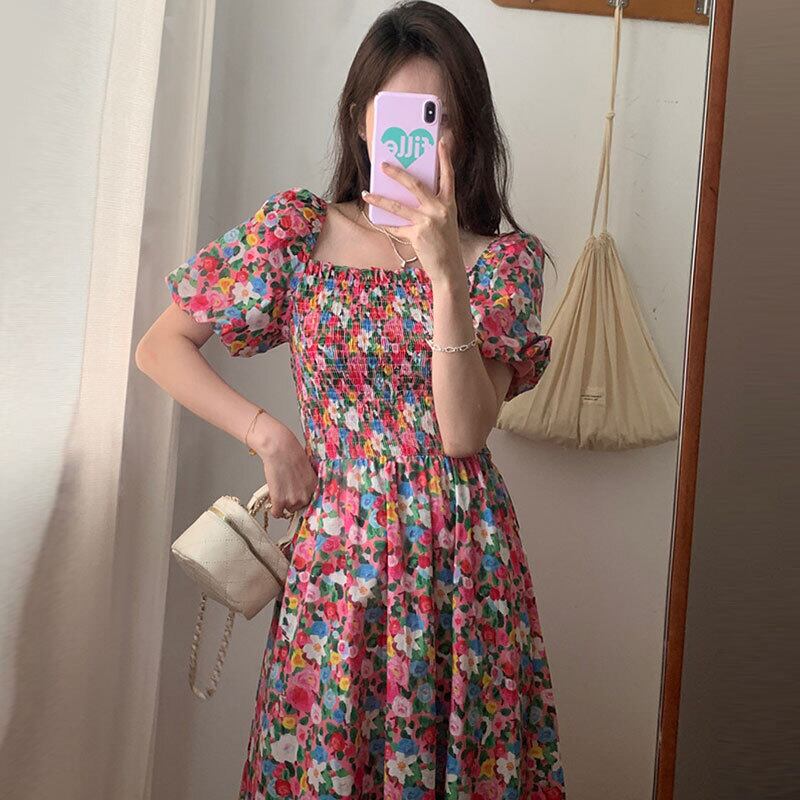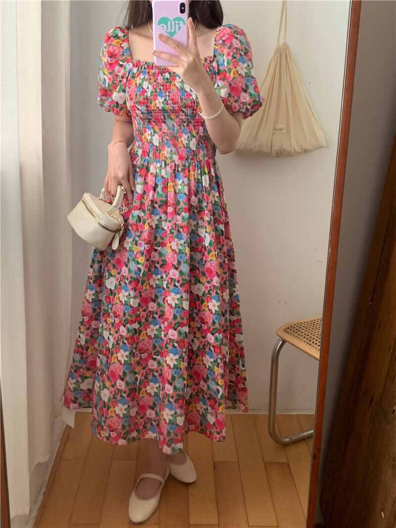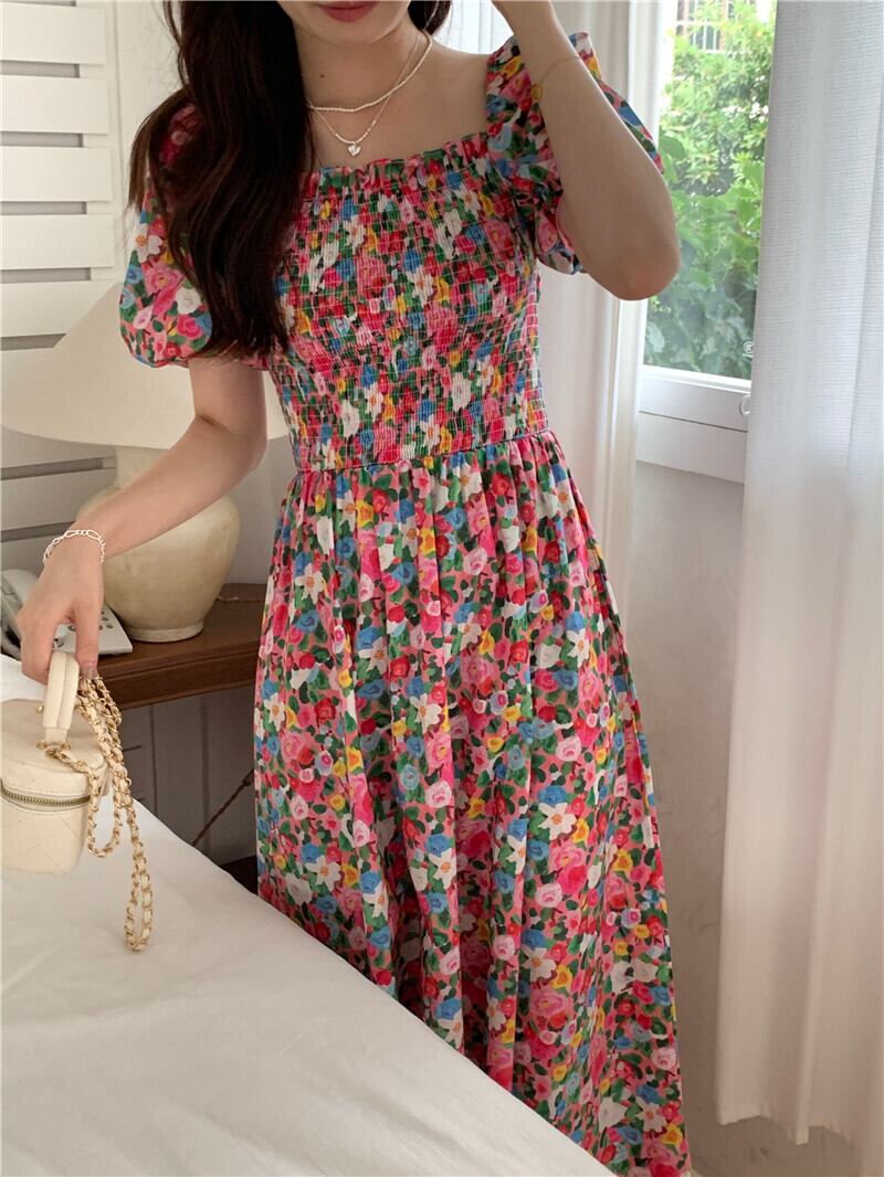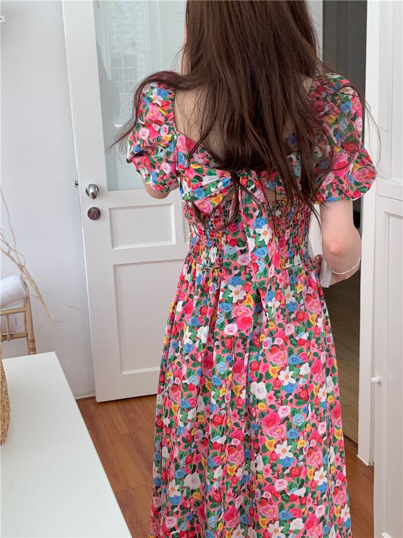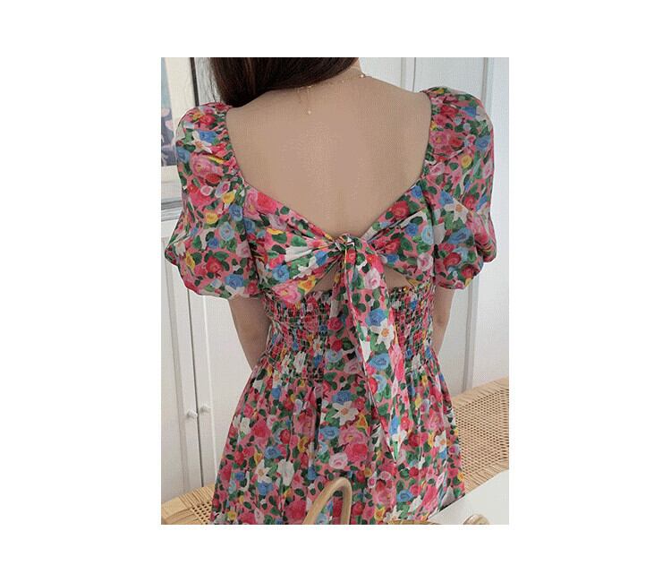 サマープリーツバックリボンスリーブフローラルドレス 夏物 花柄 スクウェア 7/20 mi4658819070814